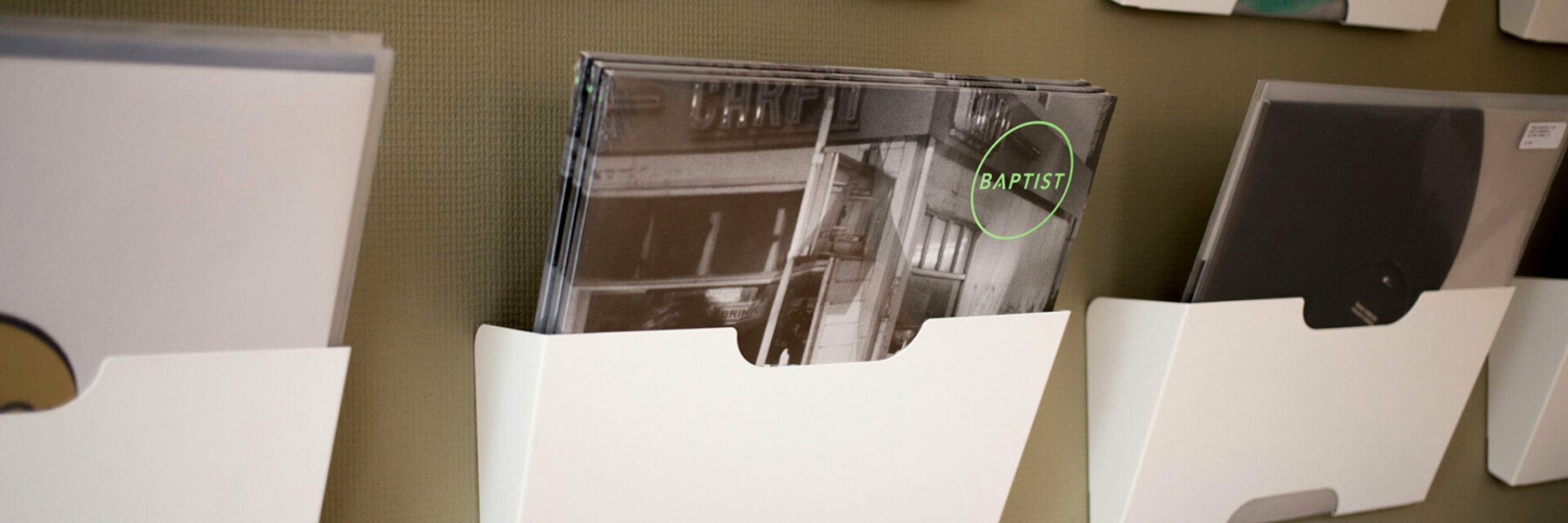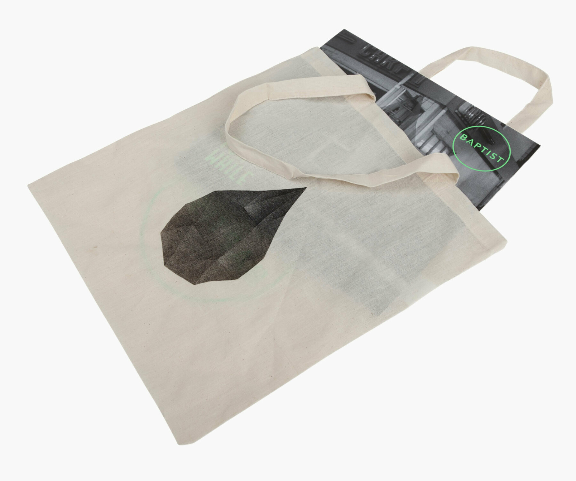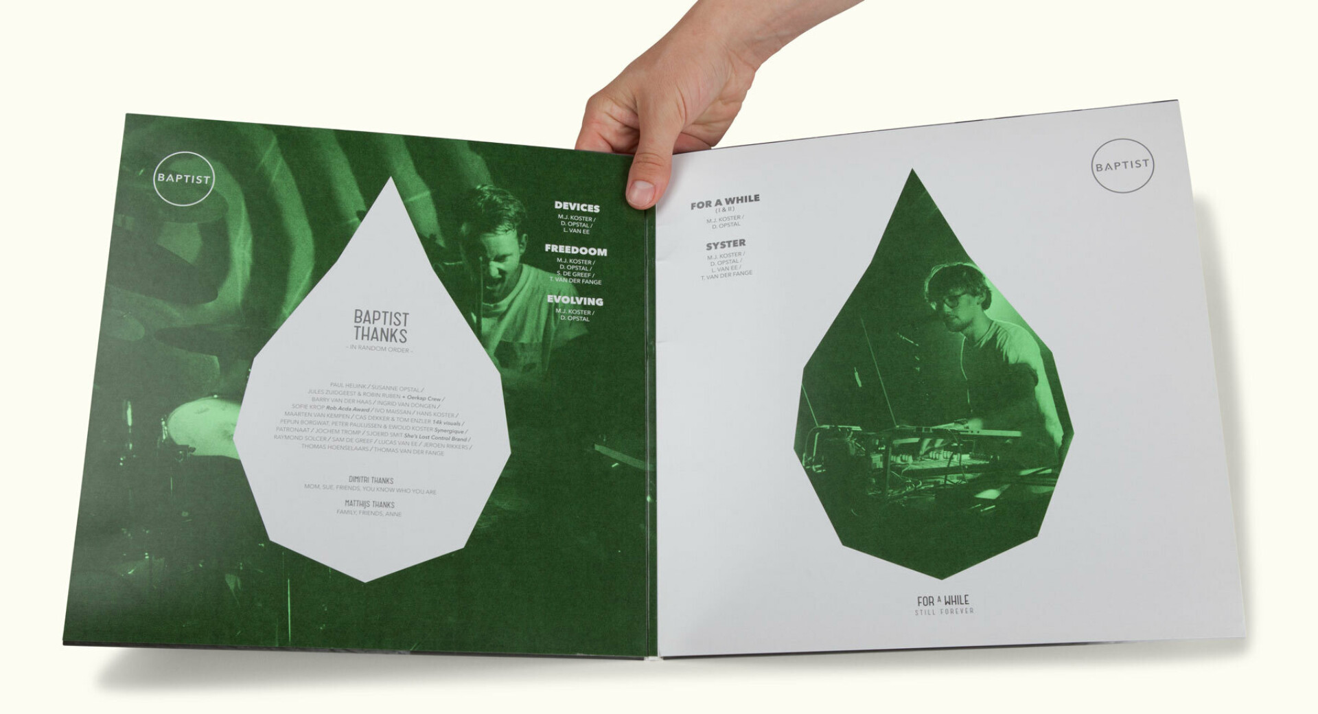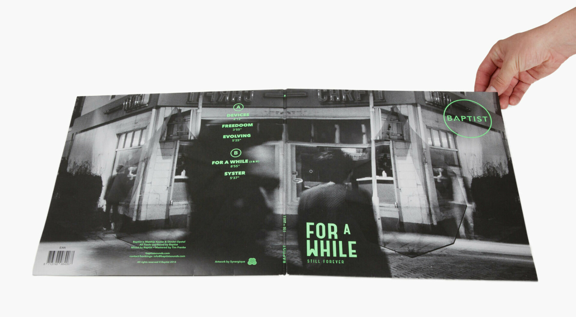 Baptist is een band die elektronische muziek maakt, vaak met een combinatie van analoge en digitale instrumenten. Het contrast tussen deze twee was daarom ook de basis van het ontwerp van de eerste EP van de Haarlemse band Baptist getiteld ‘For A While’. Synergique maakte voor het artwork van de EP een polygone druppel en projecteerde daarop een foto. Dit beeld werd op zijn beurt weer op twee manieren gefotografeerd waardoor er zowel een digitale fotolaag als een analoge projectielaag in hetzelfde beeld aanwezig zijn. Het resultaat lijkt een digitale bewerking, maar is juist een verbeelding van een fysieke ‘analoge’ installatie.