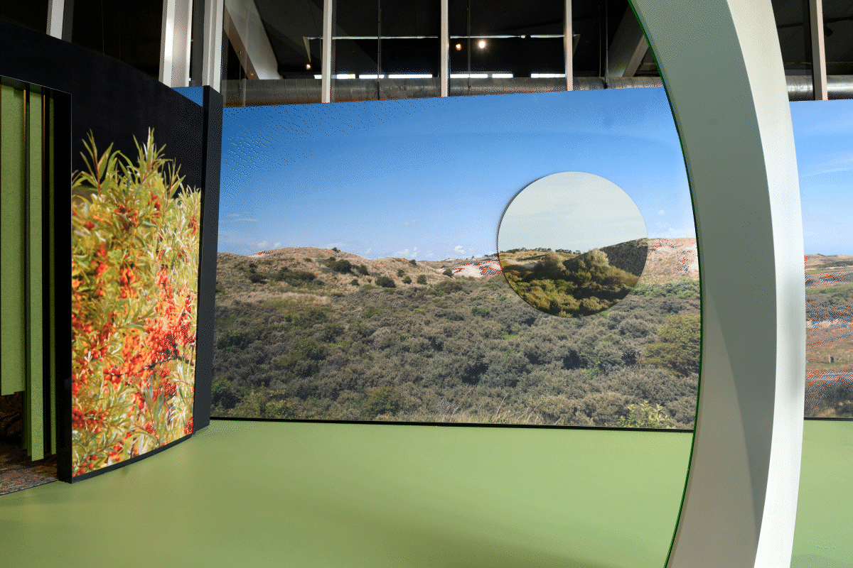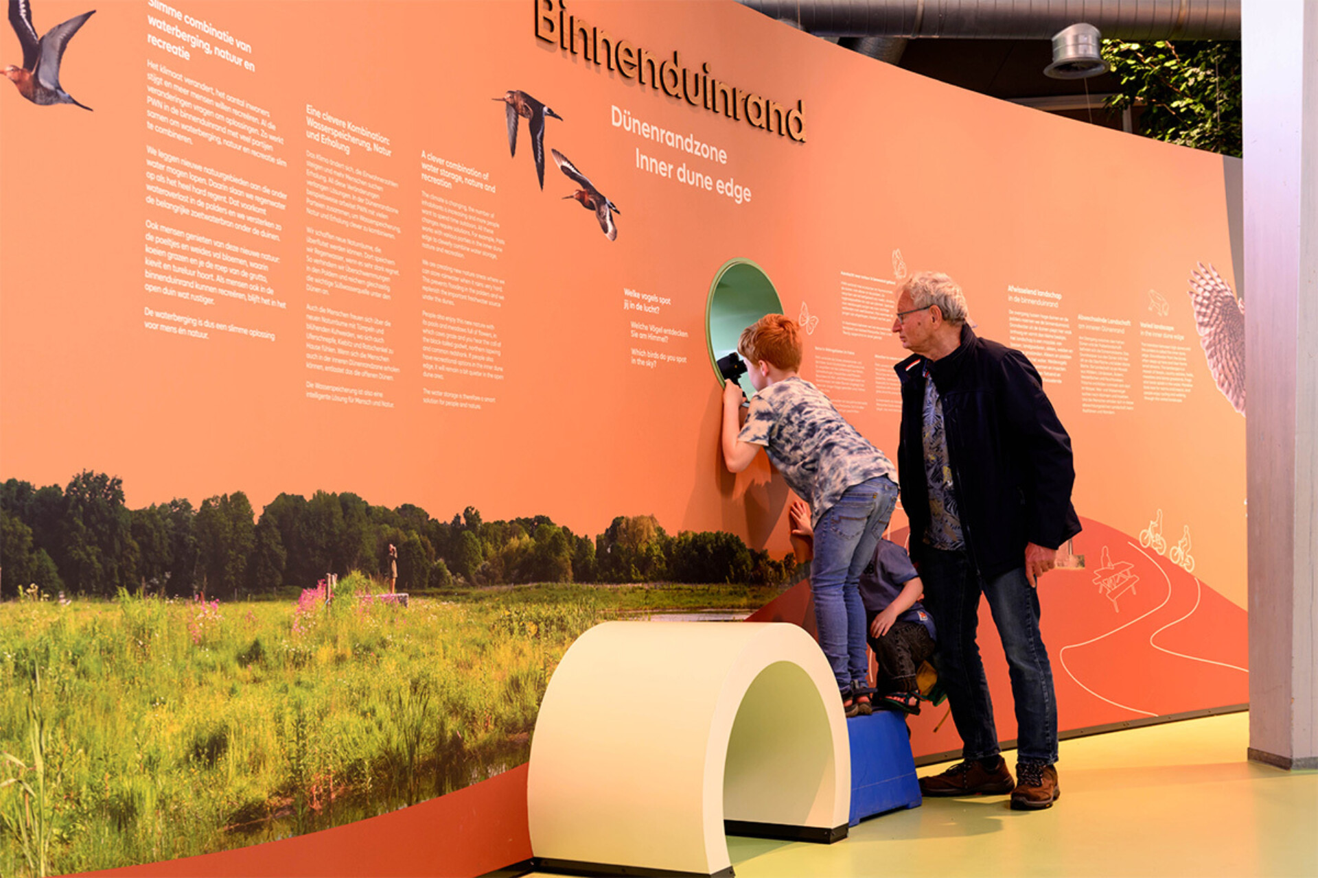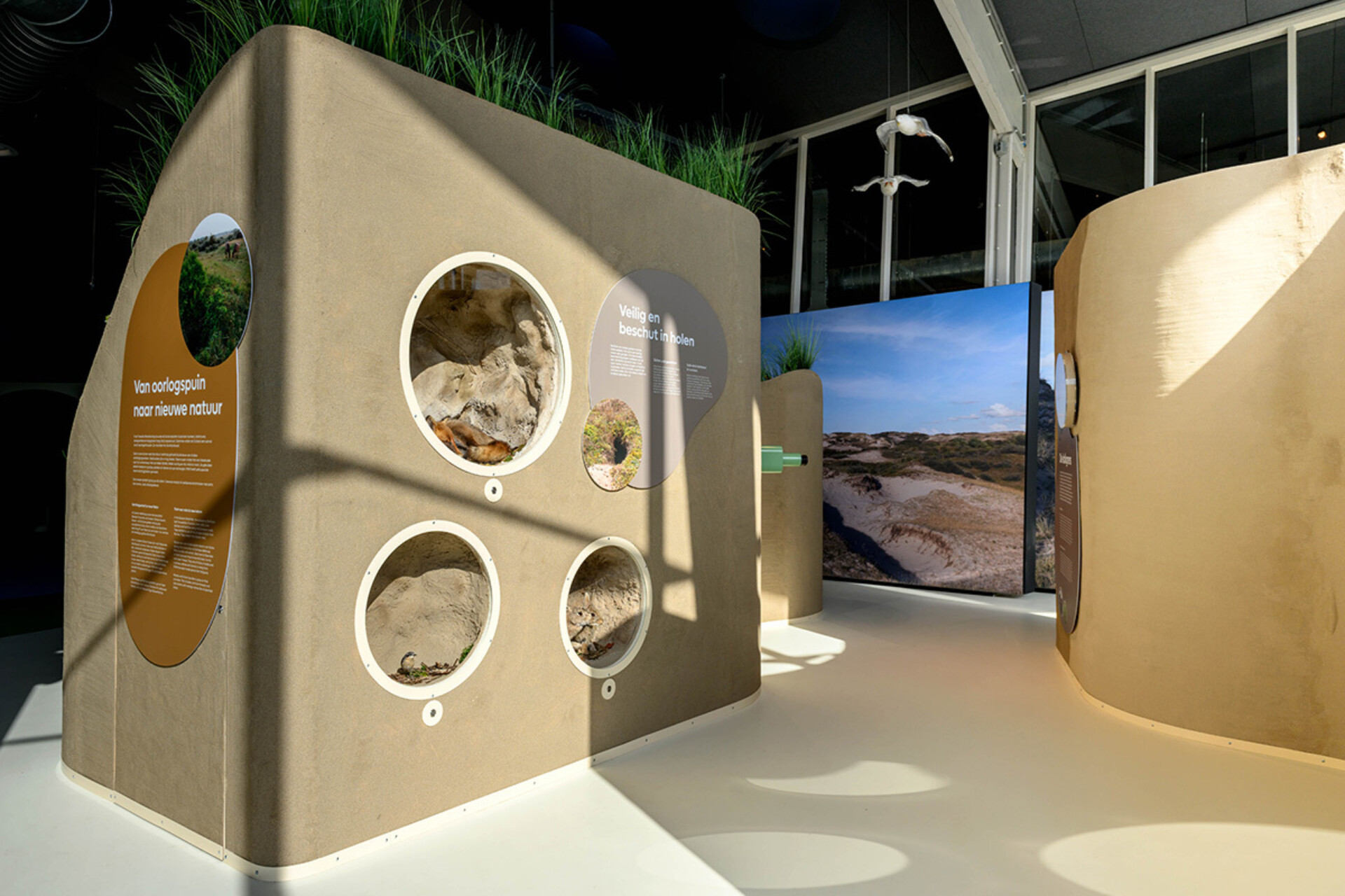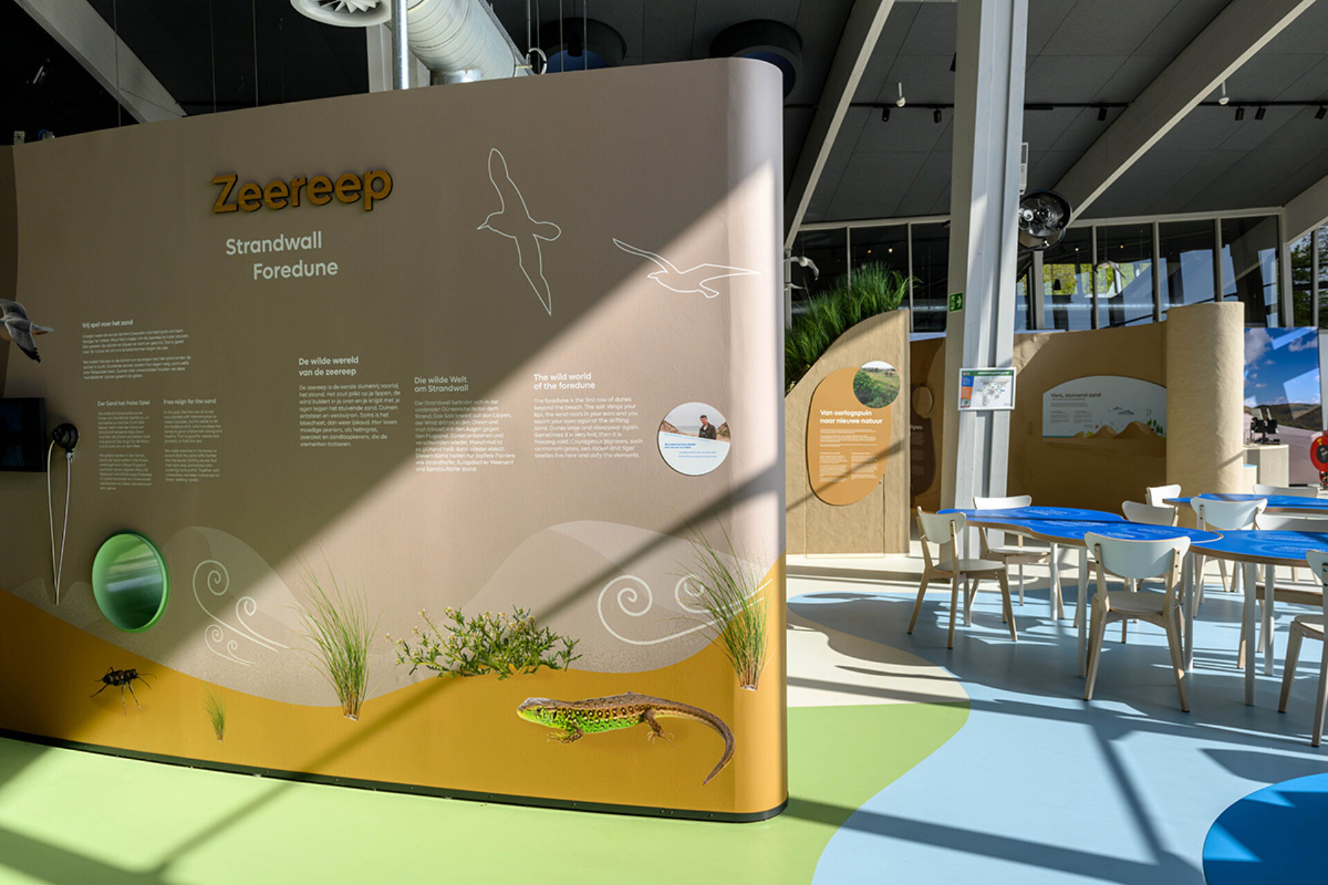In het bezoekerscentrum kom je de zes landschapstypen tegen die ook in het Noord-Hollands Duinreservaat te vinden zijn. In elk landschapstype maken we kennis met een hoofdrolspeler die uitgelicht wordt in een ‘netwerkkader’ waarin het landschap in 3d is nagemaakt.