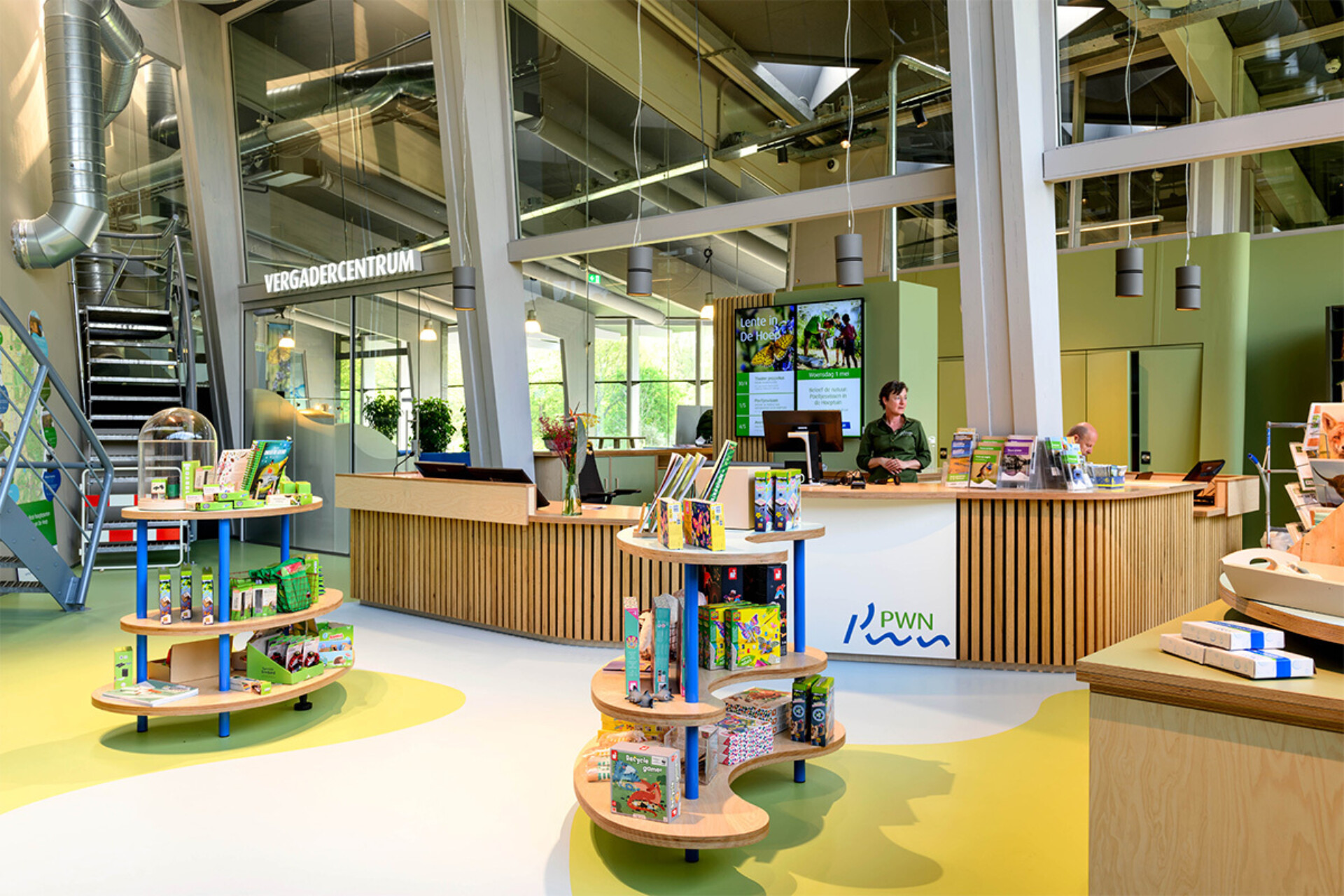 De balie en winkel van het bezoekerscentrum combineren drie functies: bezoekers verwelkomen, producten verkopen, en informatie verstrekken. De natuurlijke materialen en kleuren zorgen voor een uitnodigende sfeer en creëren een vloeiende overgang tussen het entreegebied en de vaste presentatie.