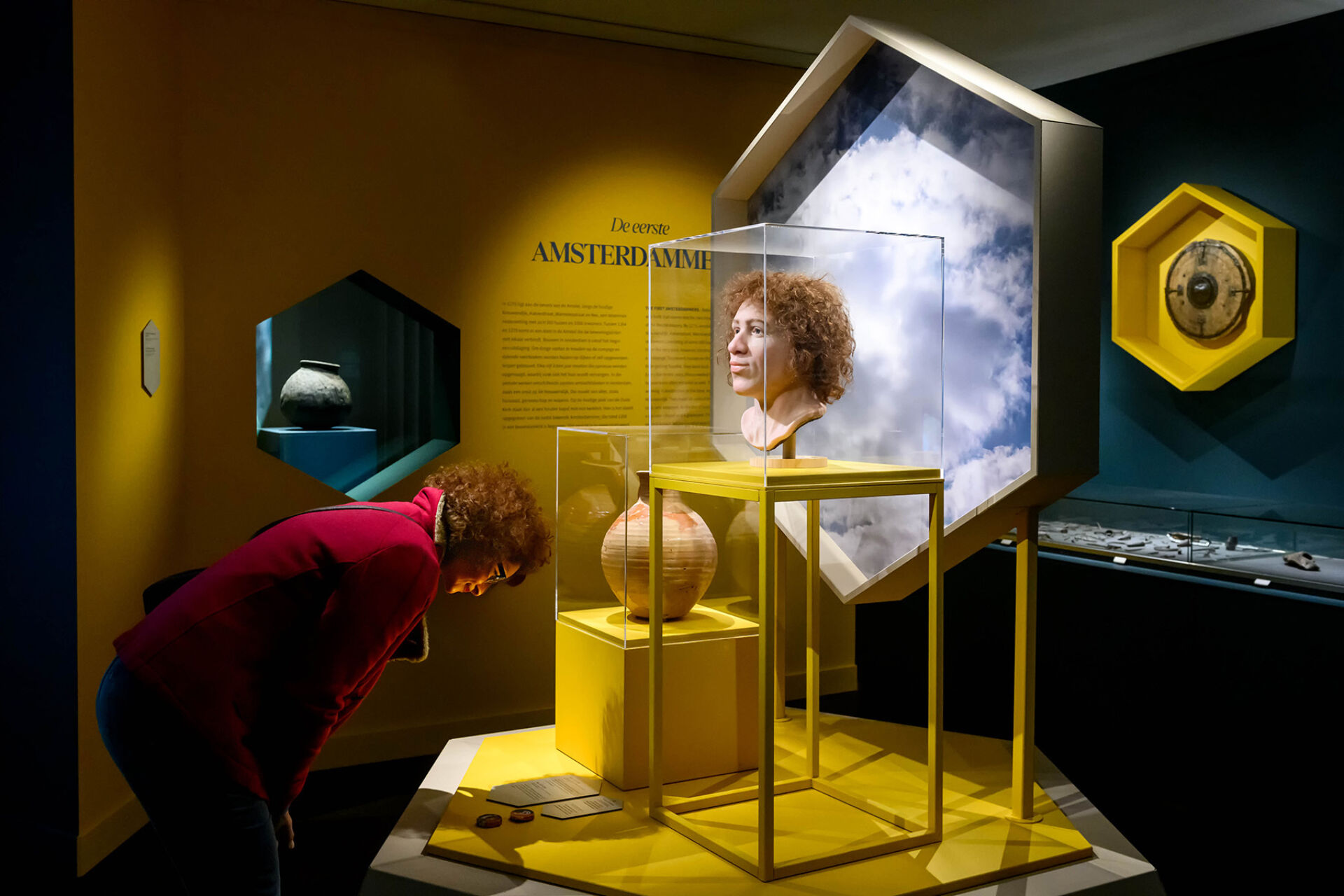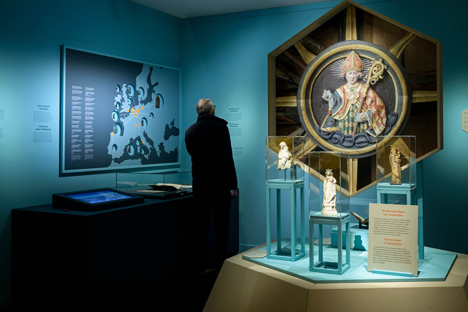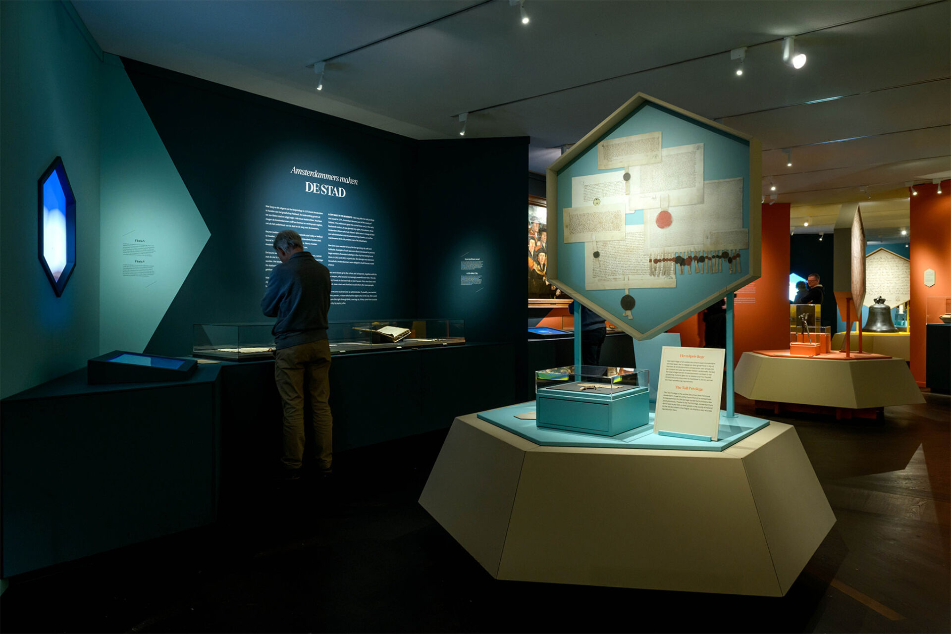 We plaatsen de middeleeuwen in een nieuw licht. Verspreid door de ruimte staan acht lichtbakens, waar archeologische vondsten naast archiefstukken worden gepresenteerd. Door de speelse animaties en de audiotour ontdek je dat de thema’s waar Amsterdammers zich 750 jaar mee bezighielden amper zijn veranderd: Handel, religie, zorg en veiligheid.