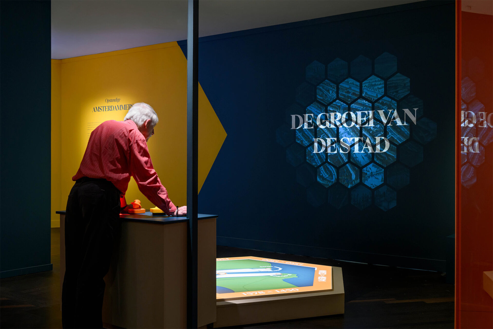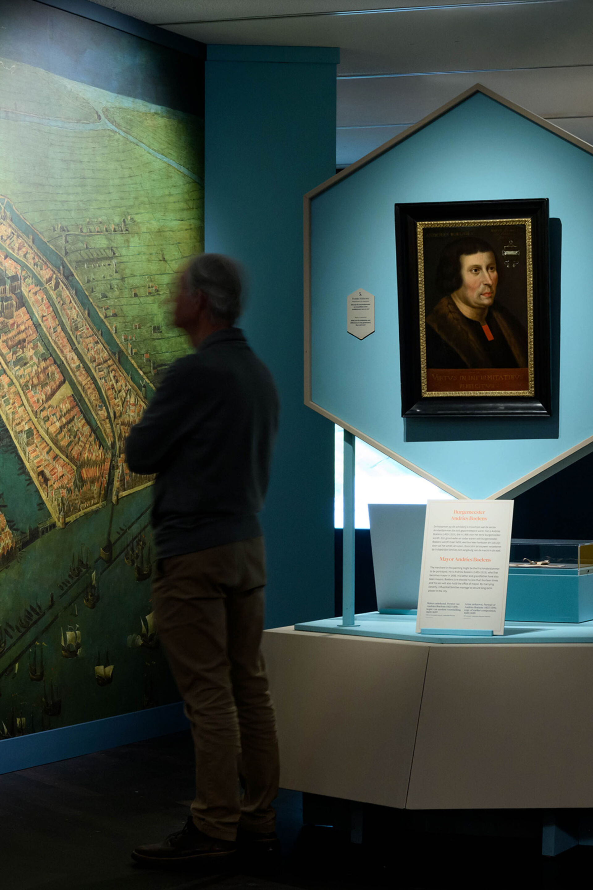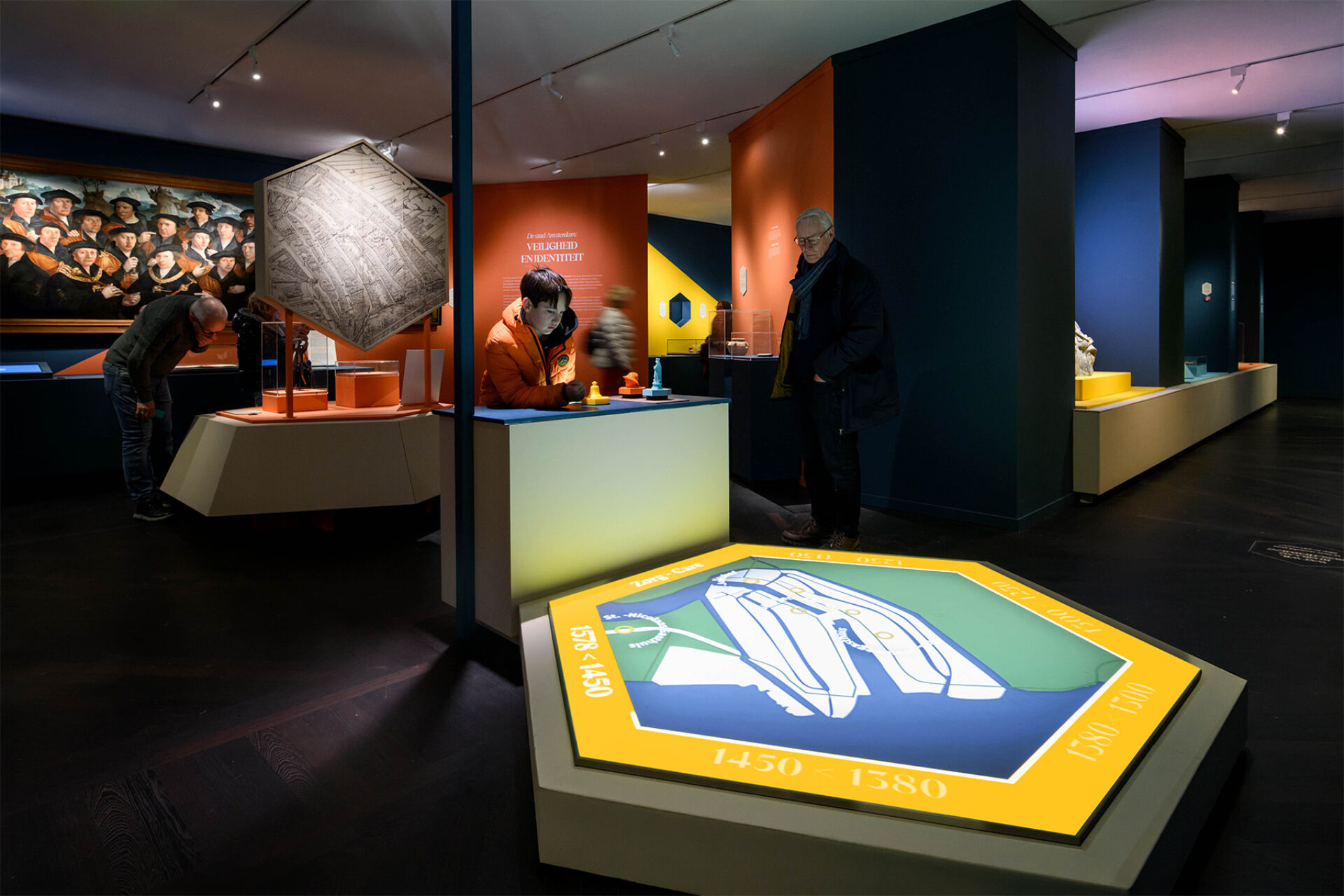 Plaats een token en ontdek hoe Amsterdam zich ontwikkelde in de middeleeuwen. De vloerprojectie toont waar jouw gekozen thema: zorg, religie of veiligheid terugkwam in de stad.