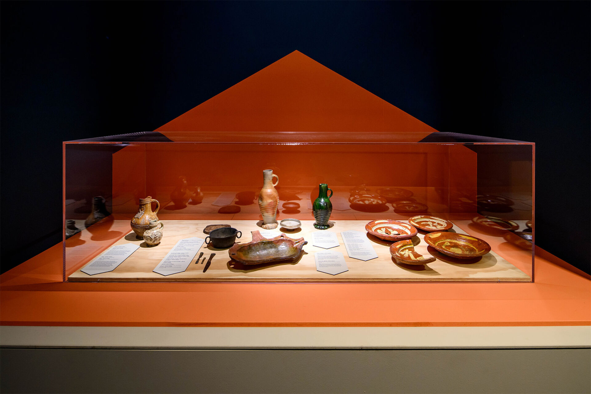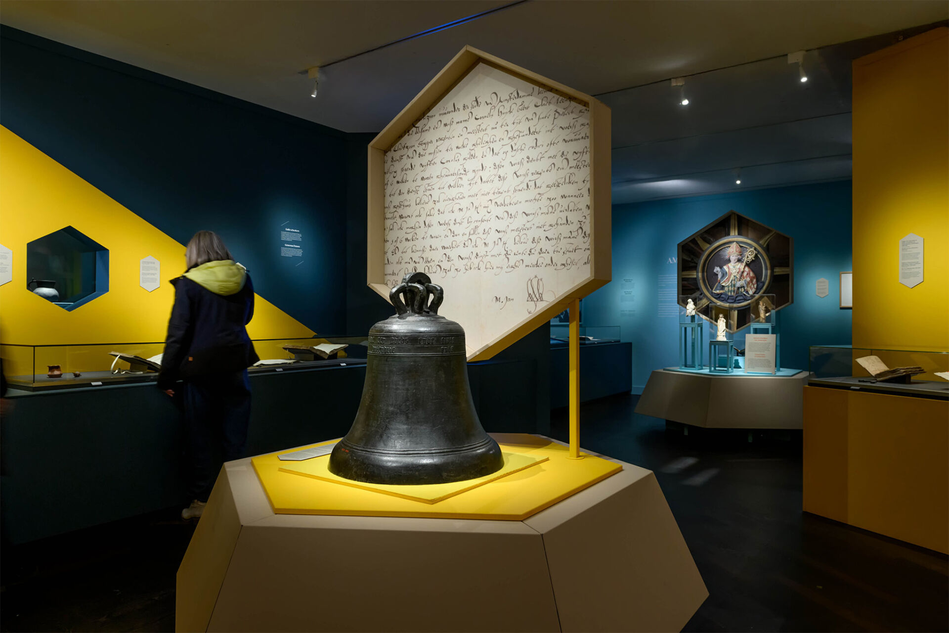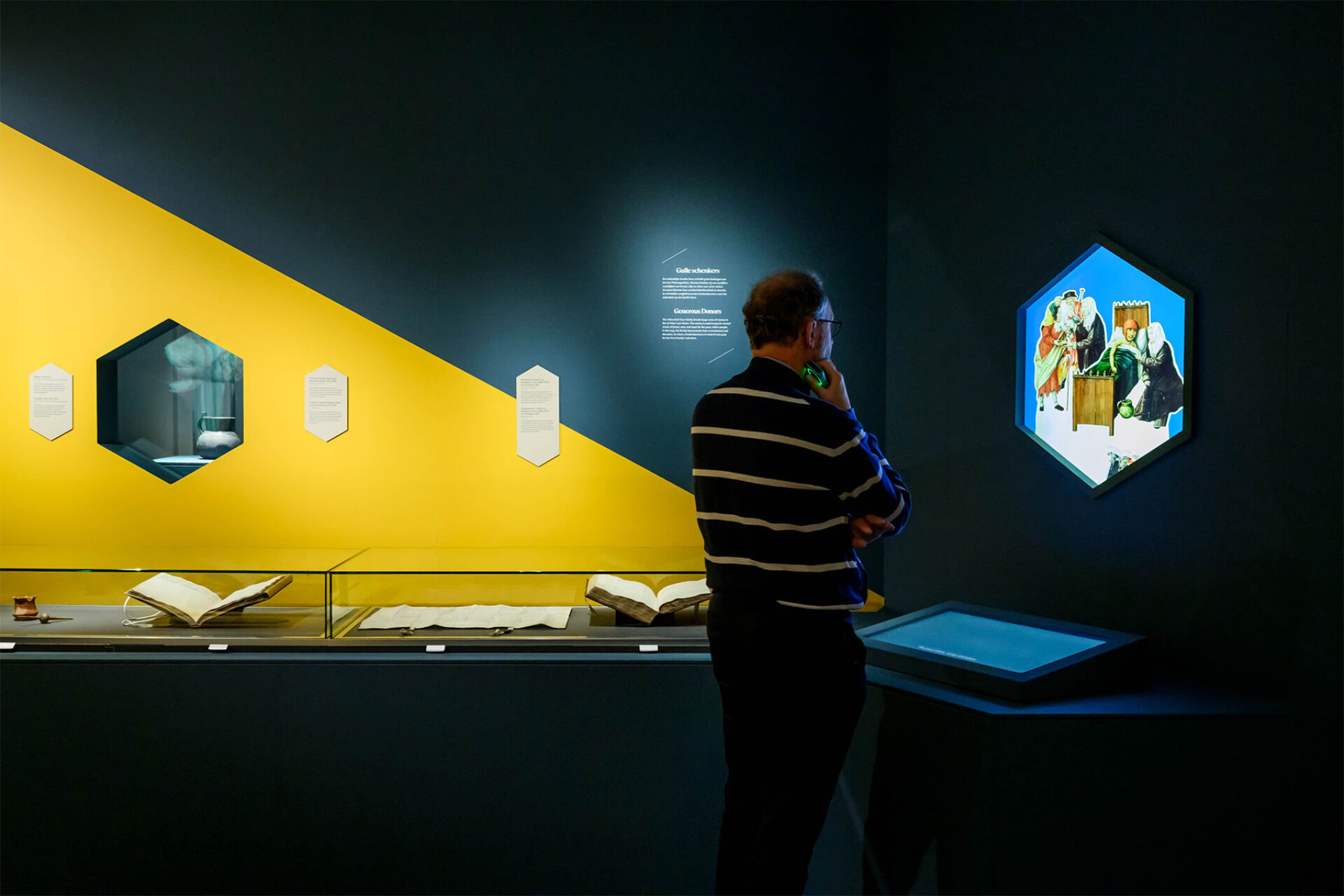 Verspreid door de ruimte staan acht lichtbakens, elk met een eigen thema. Op ooghoogte lijken archeologische vondsten te zweven, die samen met archiefstukken een bijzonder verhaal vertellen.