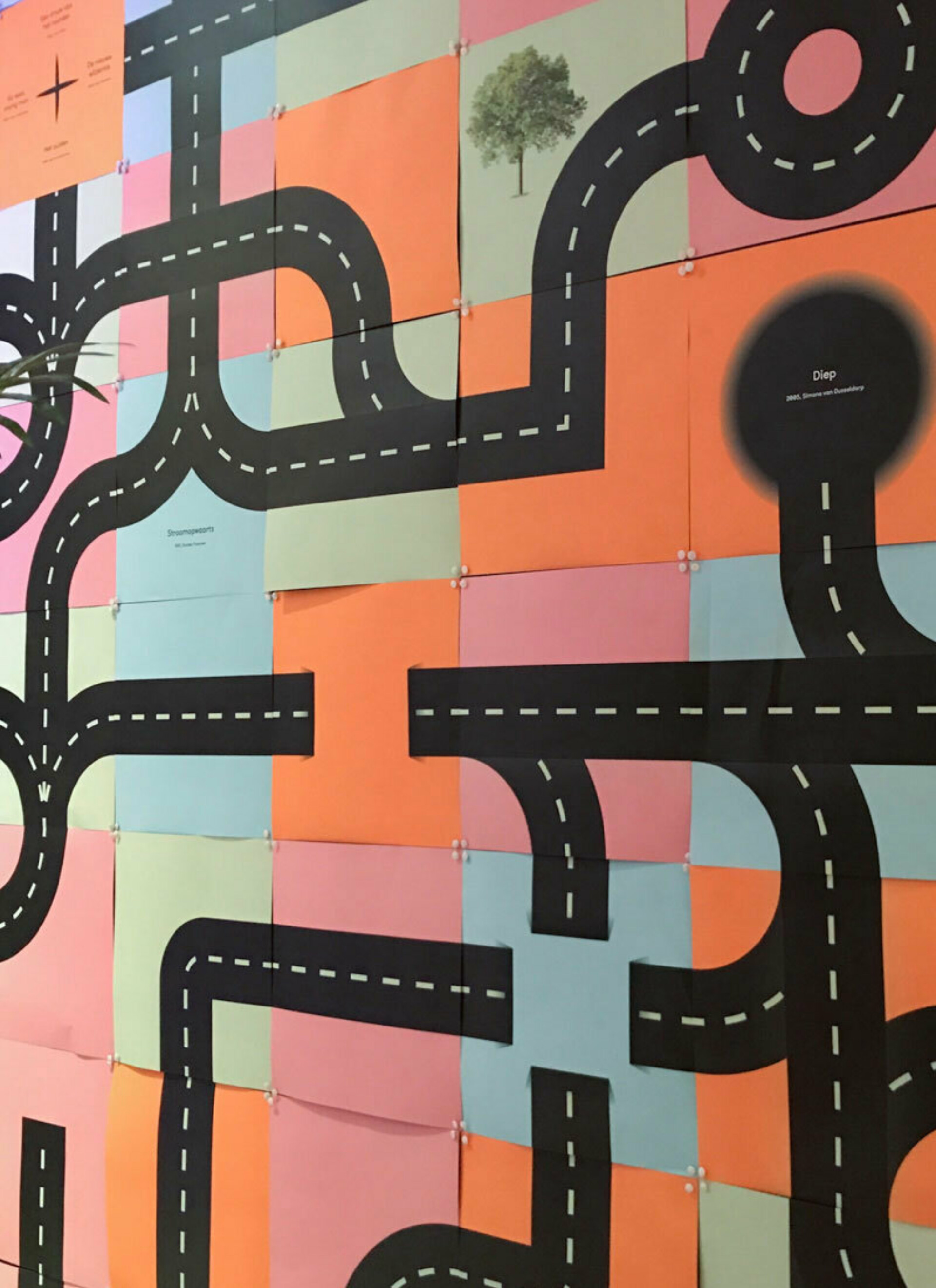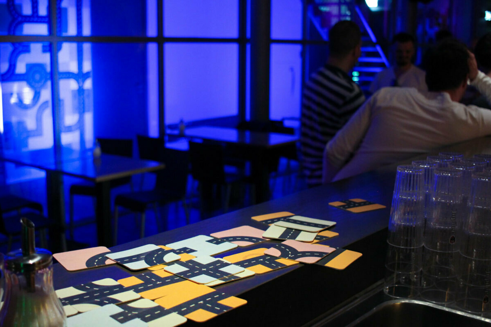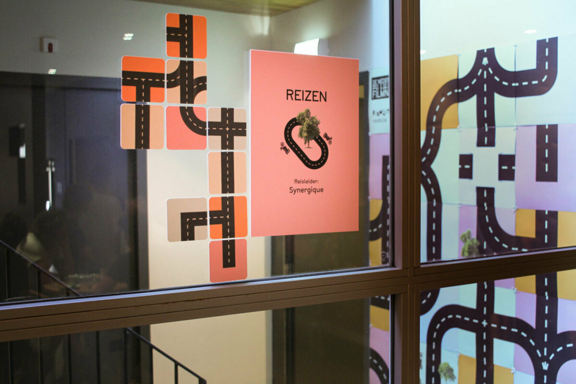 De posters (en ook de bierviltjes) pasten als een wegennetwerk aan elkaar, op talloze verschillende manieren en doken overal in de Toneelschuur op. Op de gevel, in de wc, geanimeerd op de informatieschermen en als background bij de DJ’s.