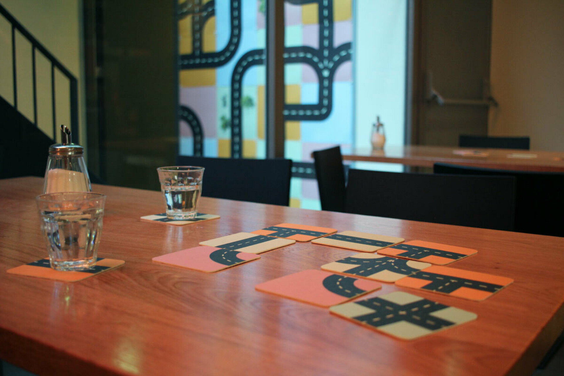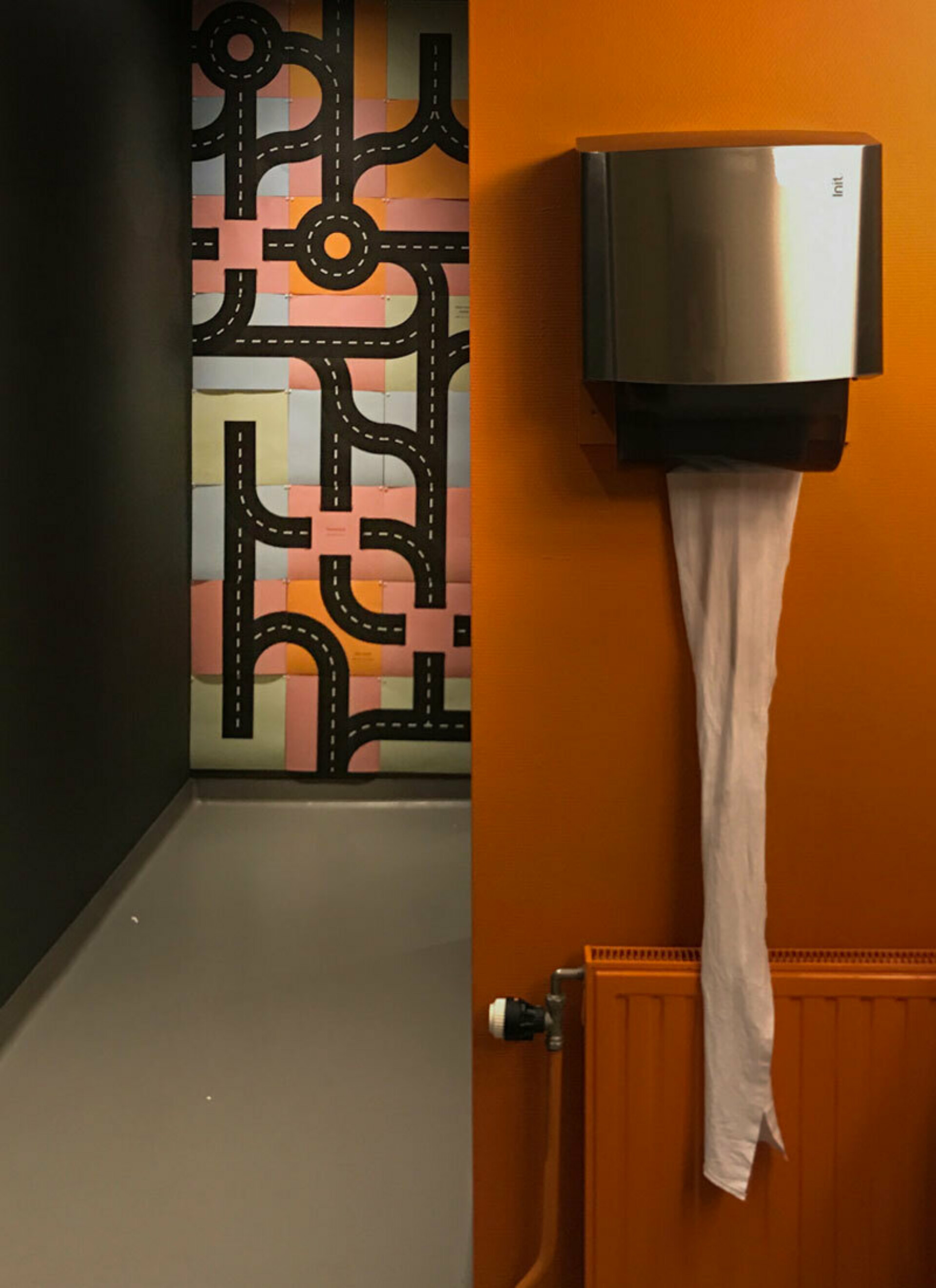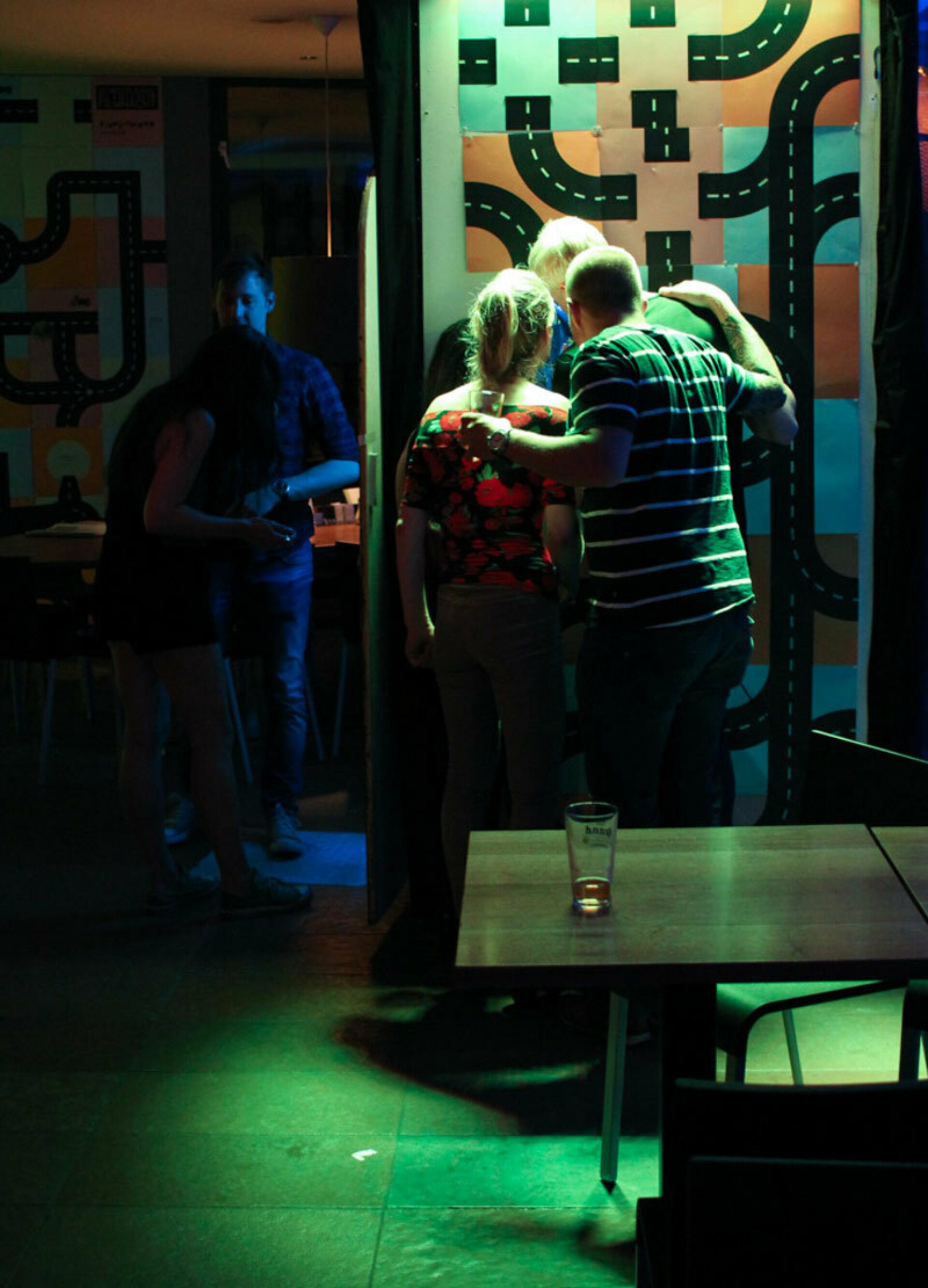 De posters (en ook de bierviltjes) pasten als een wegennetwerk aan elkaar, op talloze verschillende manieren en doken overal in de Toneelschuur op. Op de gevel, in de wc, geanimeerd op de informatieschermen en als background bij de DJ’s.