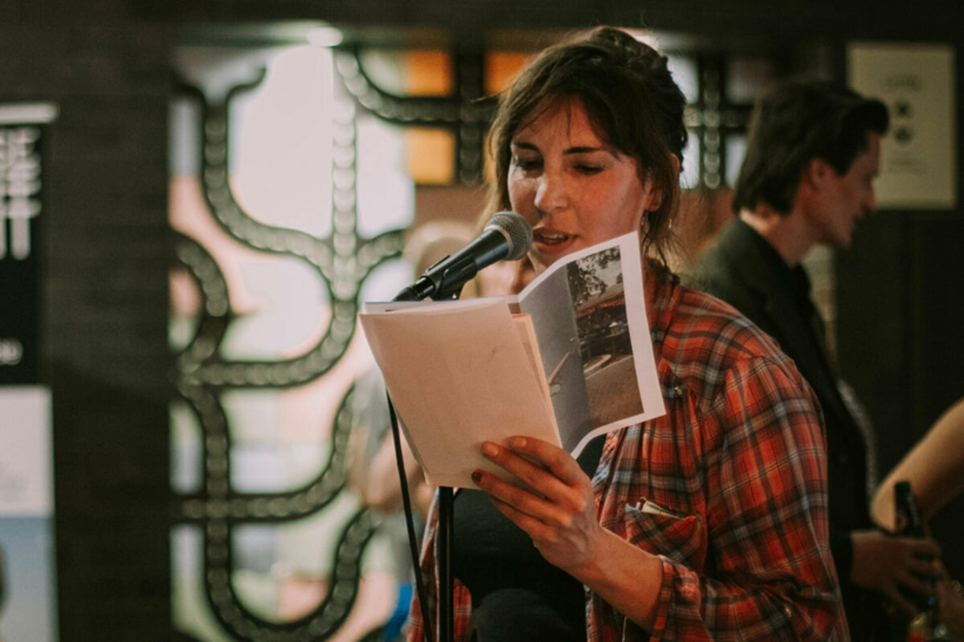 Het kleurenschema en het wegmarkeringsthema kwamen terug in de signage voor de performances, dj’s en kunstenaars, de banners in de foyer en de belettering op de enorme glazen gevel van de Toneelschuur. En één ding was in ieder geval duidelijk: er waren weinig bierviltjes over de dag na de Nederlandse Filmnacht ‘17.
