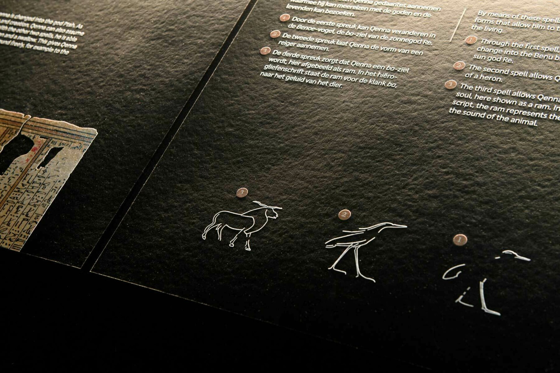 Enerzijds vertelt de tentoonstelling over de spreuken in het dodenboek zelf, anderzijds gaat het over het restauratieproces waar onder leiding van het museum ca. 4 jaar aan is gewerkt. Het dodenboek bestond ooit uit één lang stuk maar is tijdens een eerder restauratieproces in 38 vellen gesneden. De lijmlagen van eerdere restauraties zijn zorgvuldig verwijderd en het dodenboek is opnieuw in glas geconserveerd. Deze vellen zijn uitvoerig onderzocht waardoor nieuwe informatie aan het licht kwam over de manier waarop het dodenboek is gemaakt.