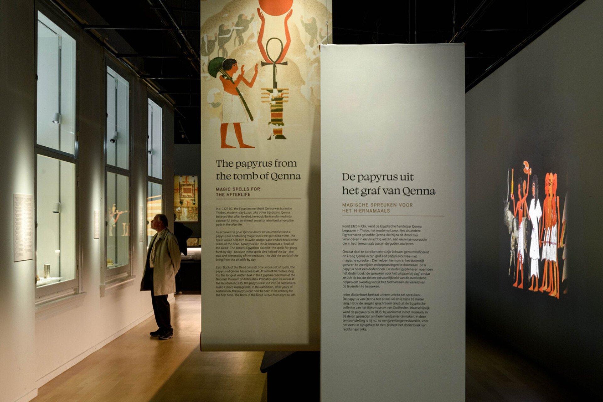 Het ‘dodenboek’ van handelaar Qenna is een Egyptische papyrusrol van meer dan zeventien meter lang en ruim drieduizend jaar oud. Het staat vol met magische spreuken, afbeeldingen van goden en symbolen. In de tentoonstelling ‘Papyrus van Qenna’ is het kleurrijke manuscript als één doorlopend geheel te zien. Dat is voor het eerst sinds de aankoop in 1835. Het is de langste papyrus uit de museumcollectie en in de afgelopen drie jaar is gewerkt aan de restauratie ervan.