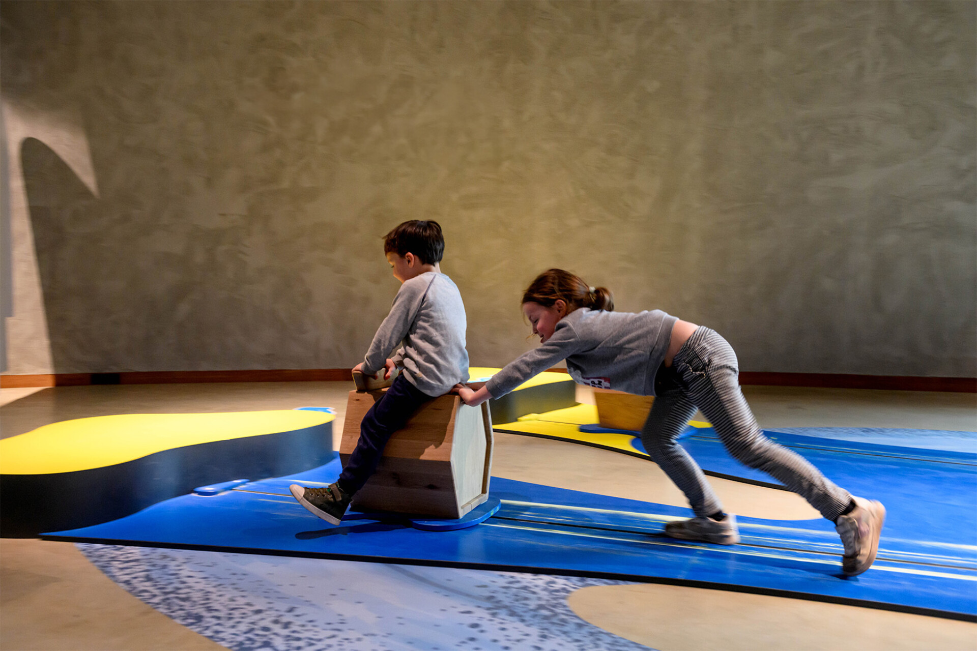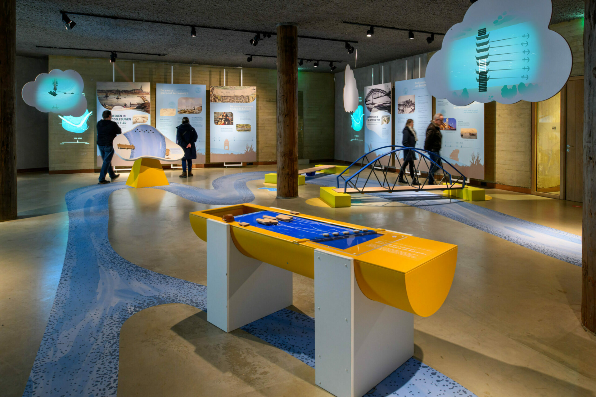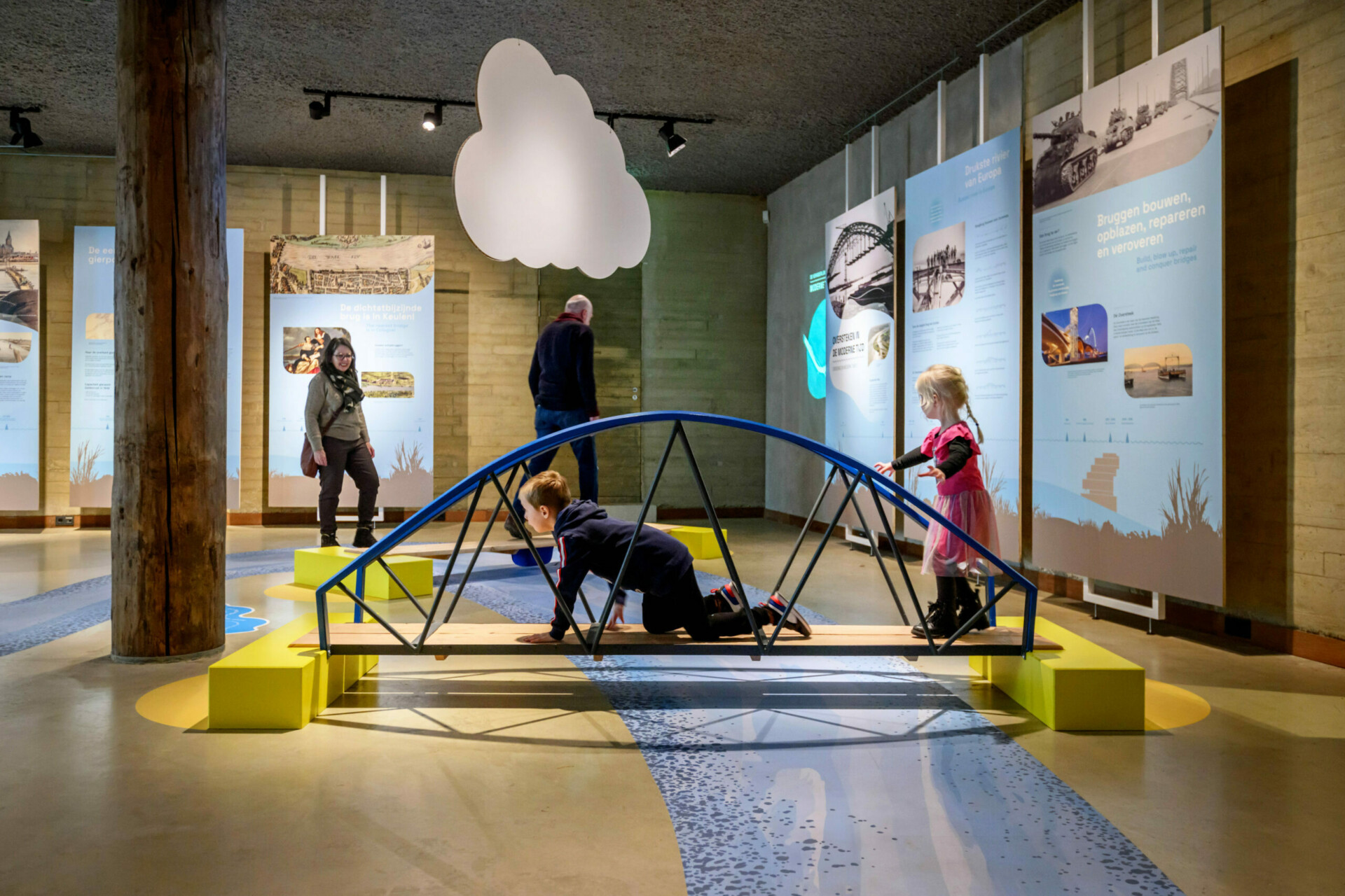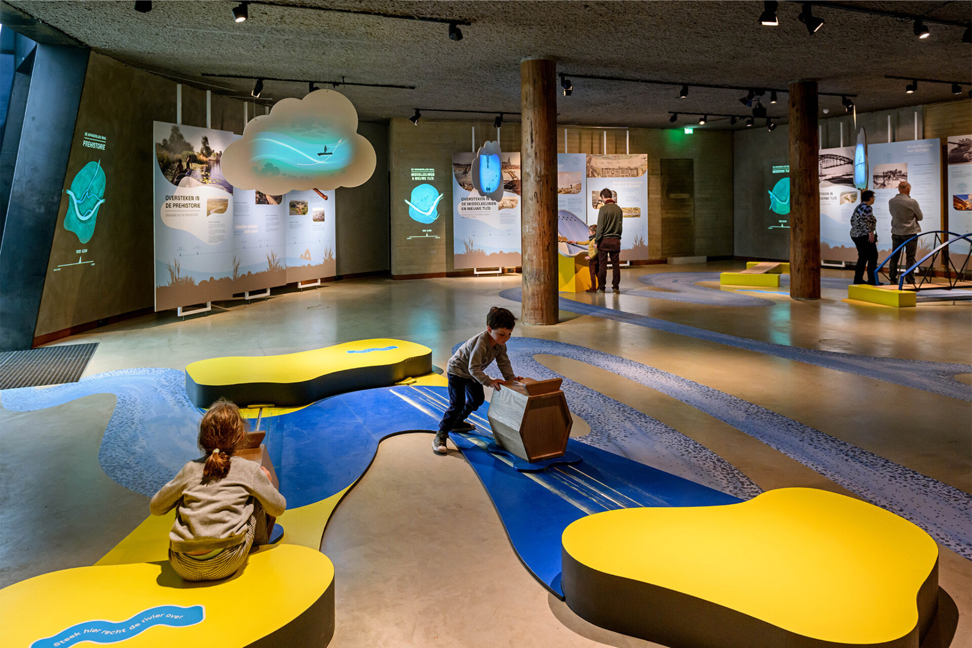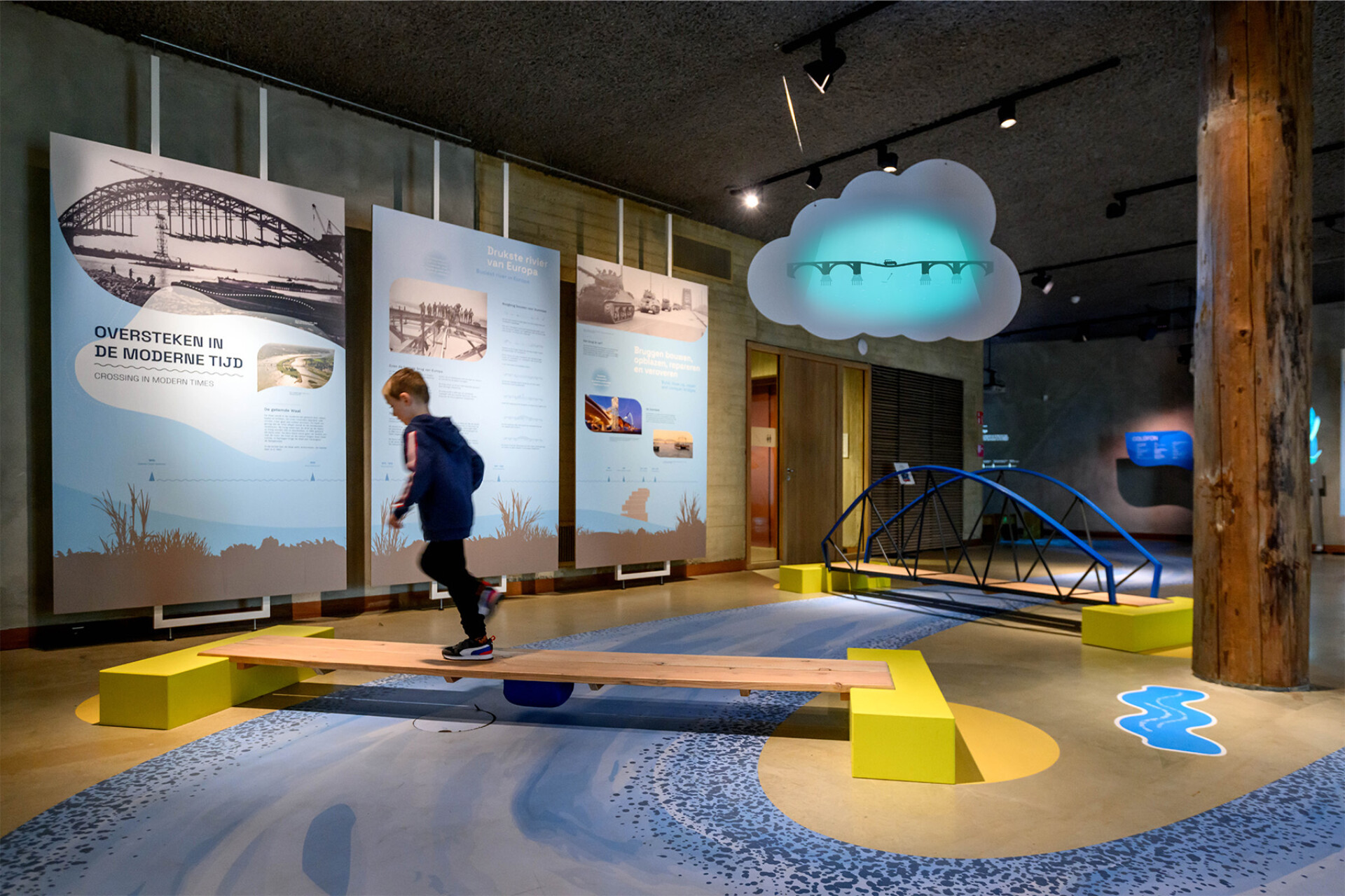Bij vier hands-on exhibits wordt de bezoeker uitgedaagd om zelf over te steken. Ervaar de stroming door met een boomstamkano de rivier te doorwaden, bouw een schipbrug, gooi het anker uit van de gierpont en ervaar de stabiliteit van de boogbrug.