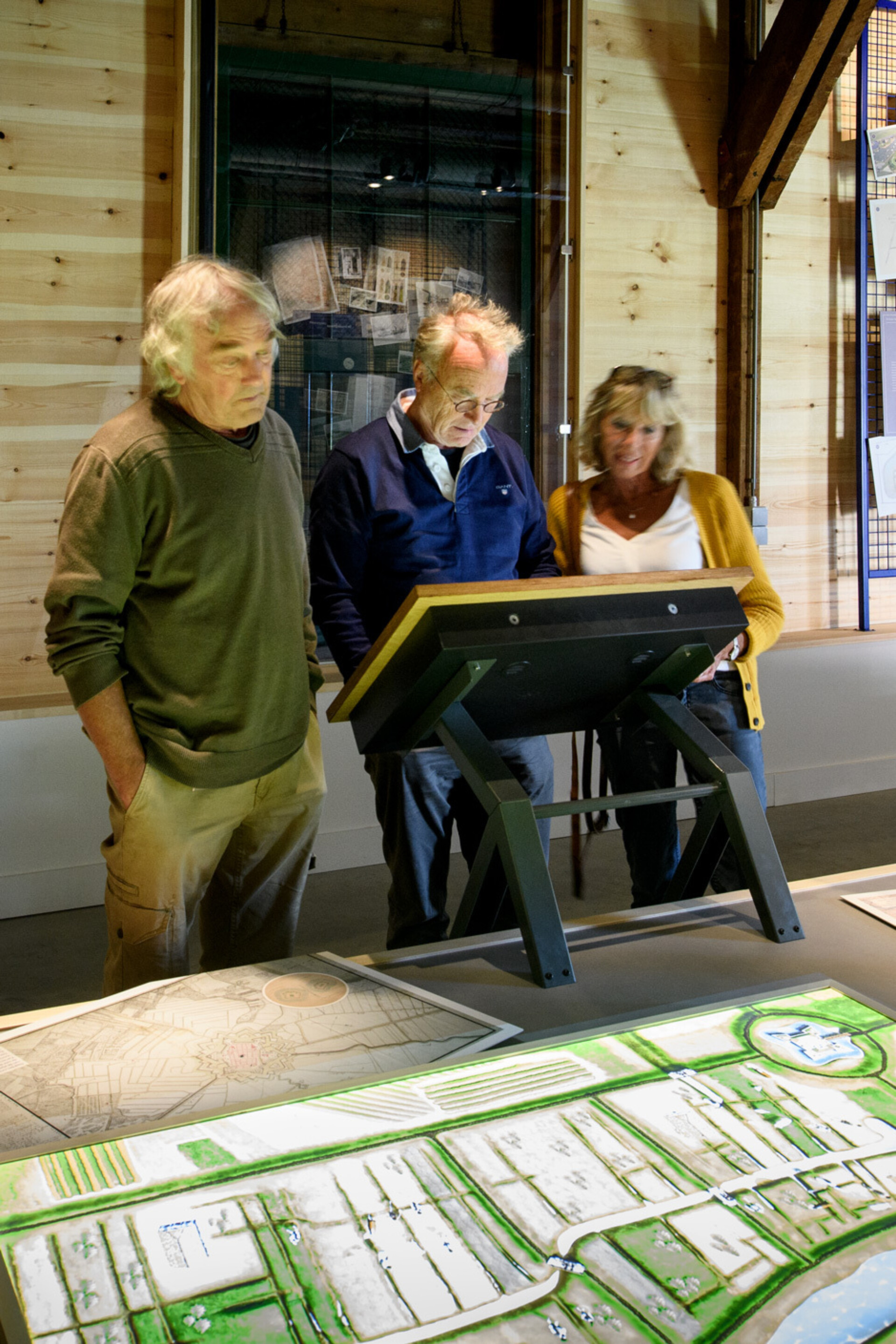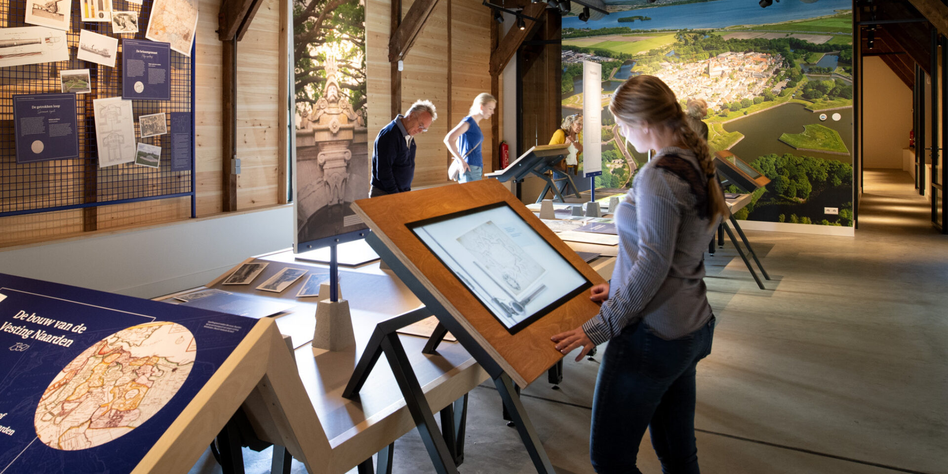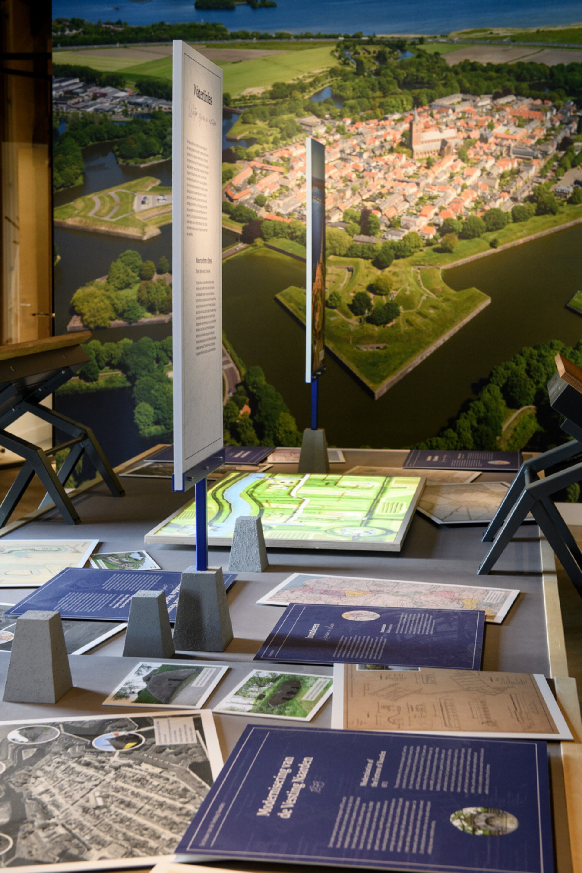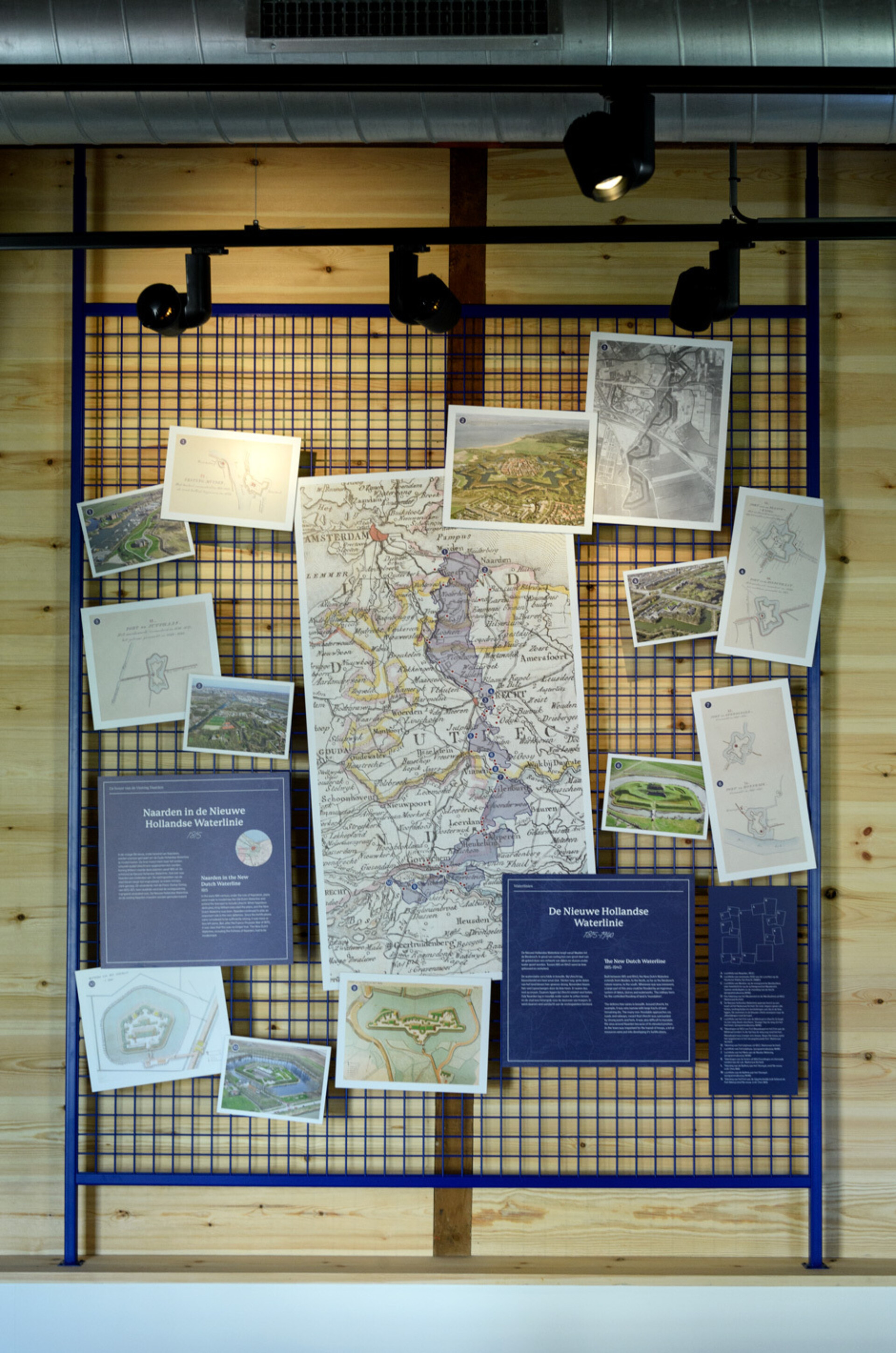 Centraal in de ruimte staat een meterslange tekentafel die inzicht geeft in alle processen die zijn komen kijken bij het integreren van de Vesting Naarden in de Nieuwe Hollandse Waterlinie. Wat meteen opvalt is hoe gedetailleerd de bouwtekeningen zijn, geen schroefje of ventilatierooster werd vergeten.