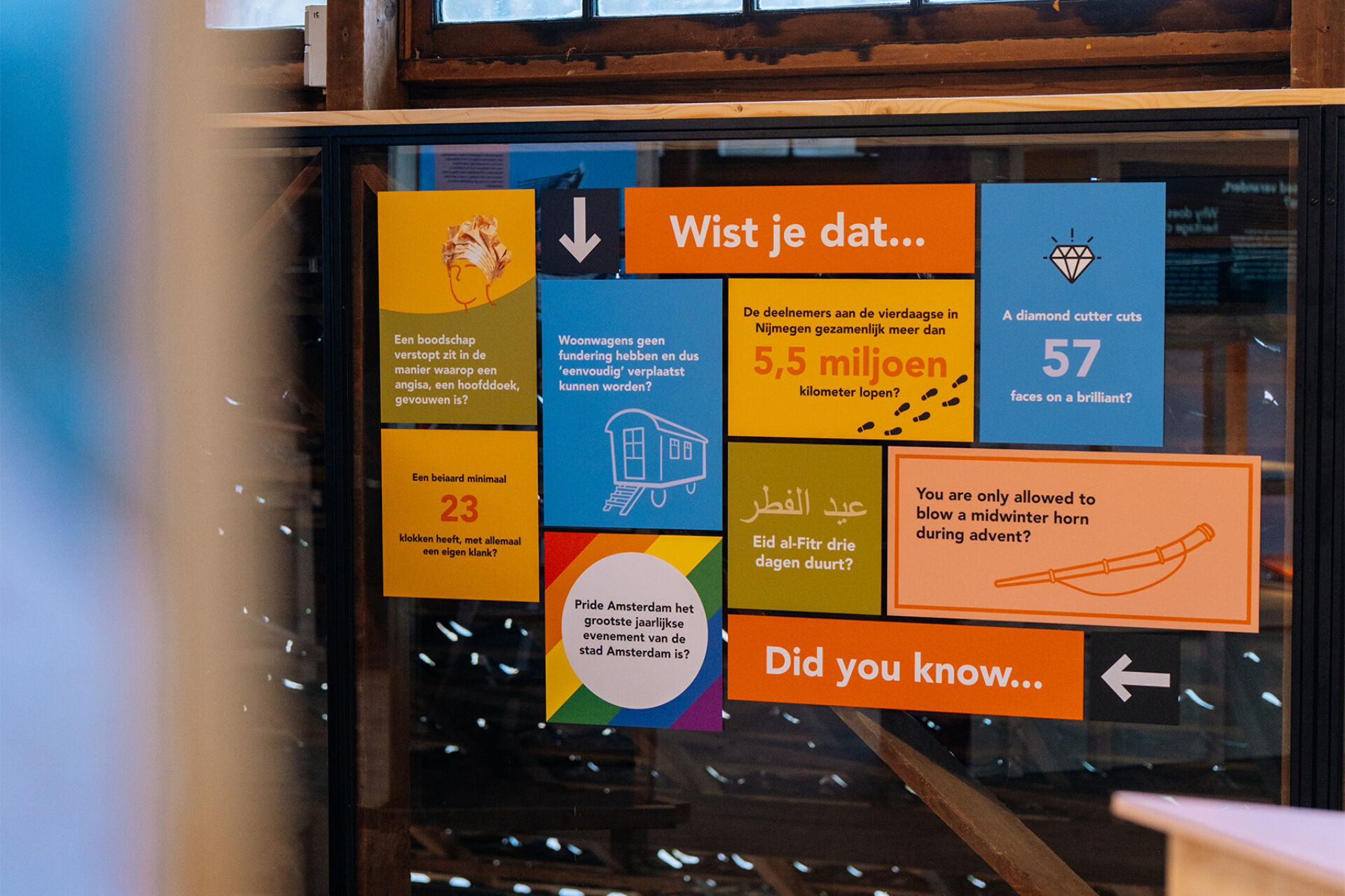 Wist-je-datjes met kleurrijke illustraties op de glazen zijwanden van de houtloods maken de vele vormen van levend immaterieel erfgoed zichtbaar.