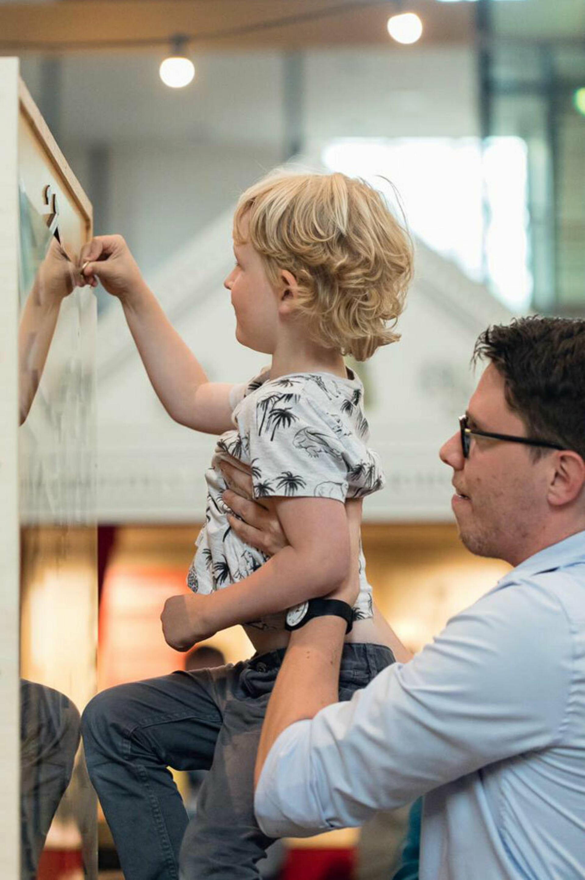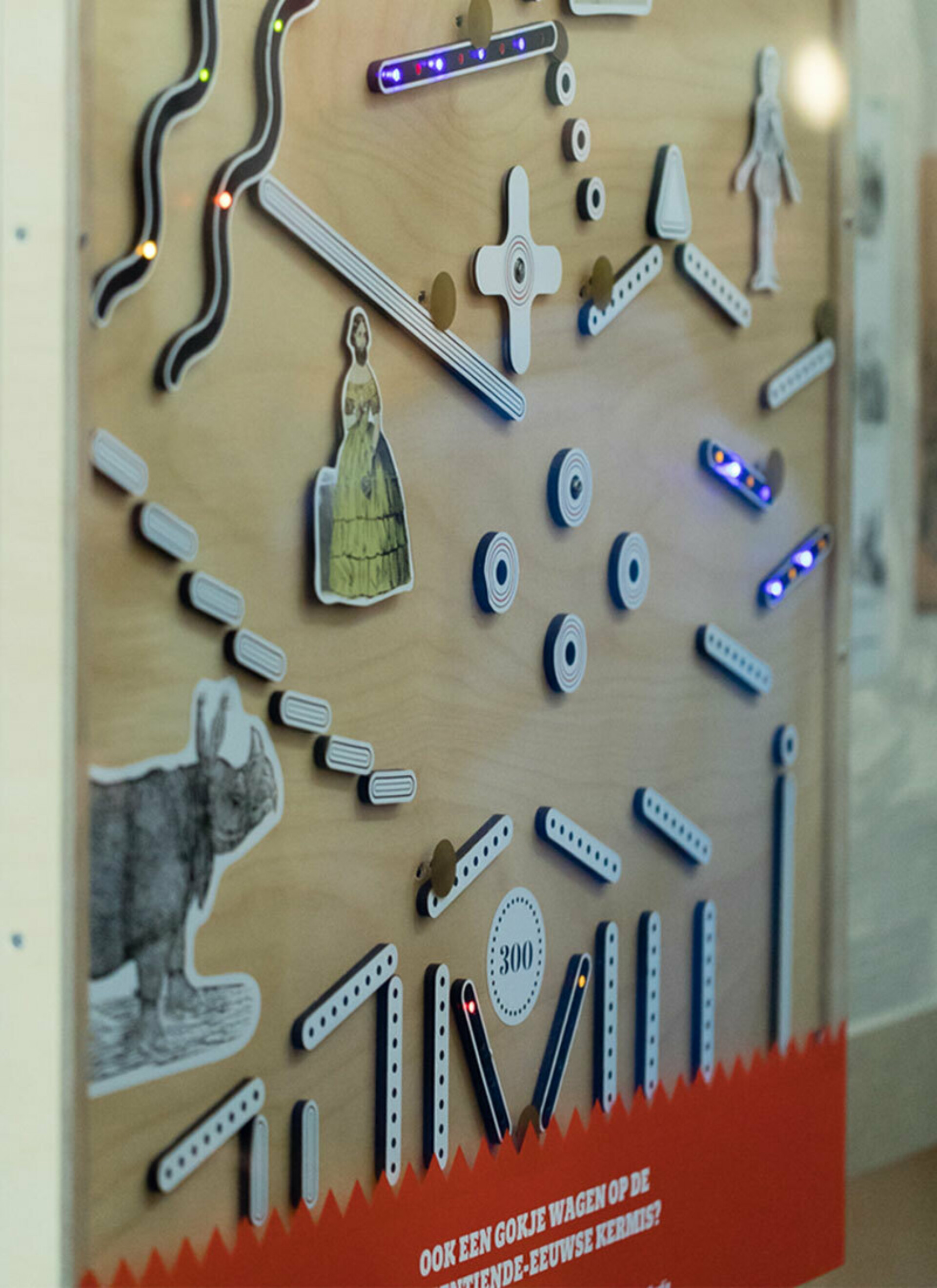 Om ook deel te nemen aan de beleving van de kermis, mag er binnen de tentoonstelling eigenlijk geen item ontbreken waar de bezoeker zelf mee aan de slag kan. Dat hebben we gecombineerd met de wens om bezoekers op een ludieke manier te vragen een kleine donatie te doen. Geïnspireerd op de mechanische automaten uit de 19e eeuw is deze kast als donatiepunt voor het Noord-Hollands Archief uitgedacht.