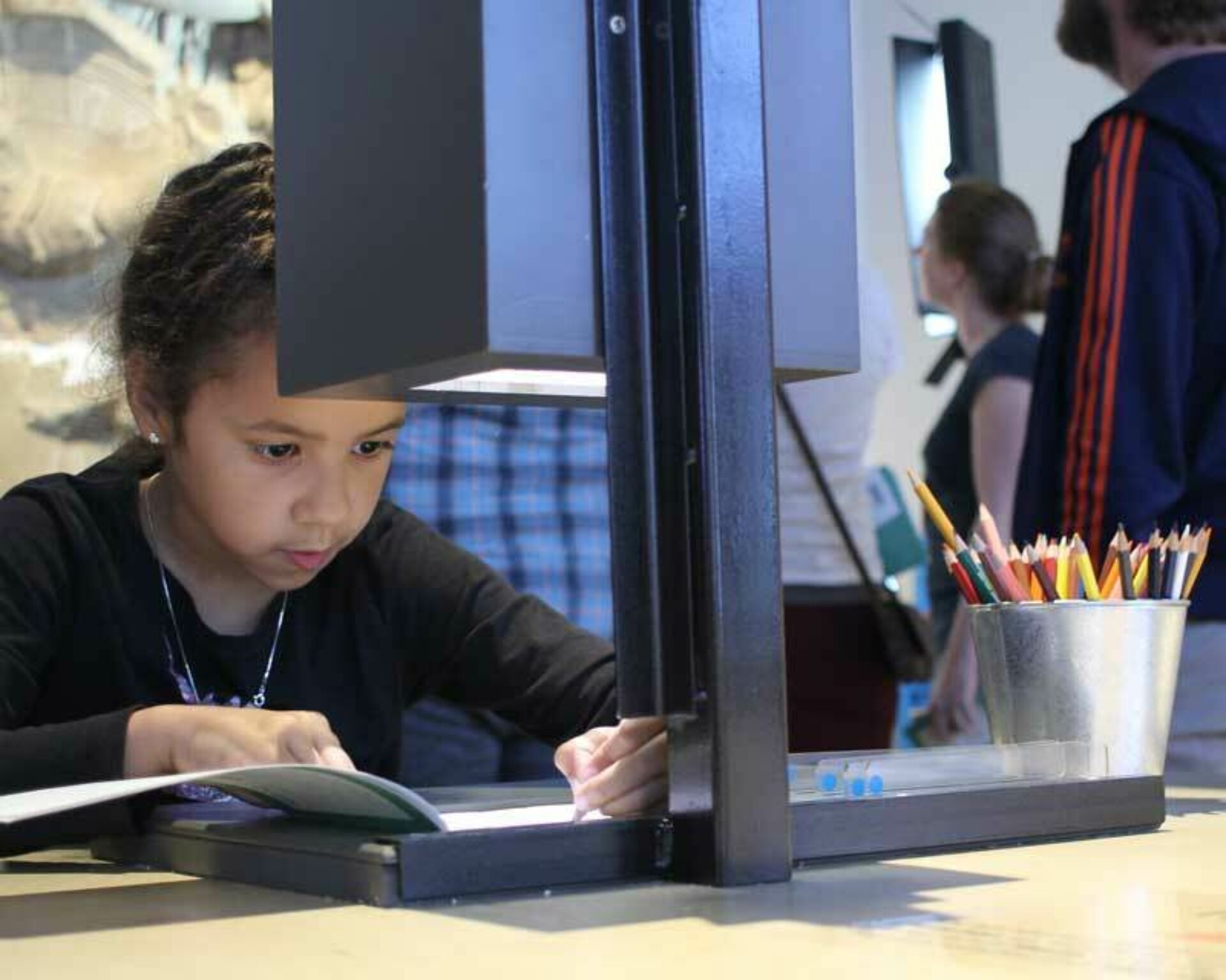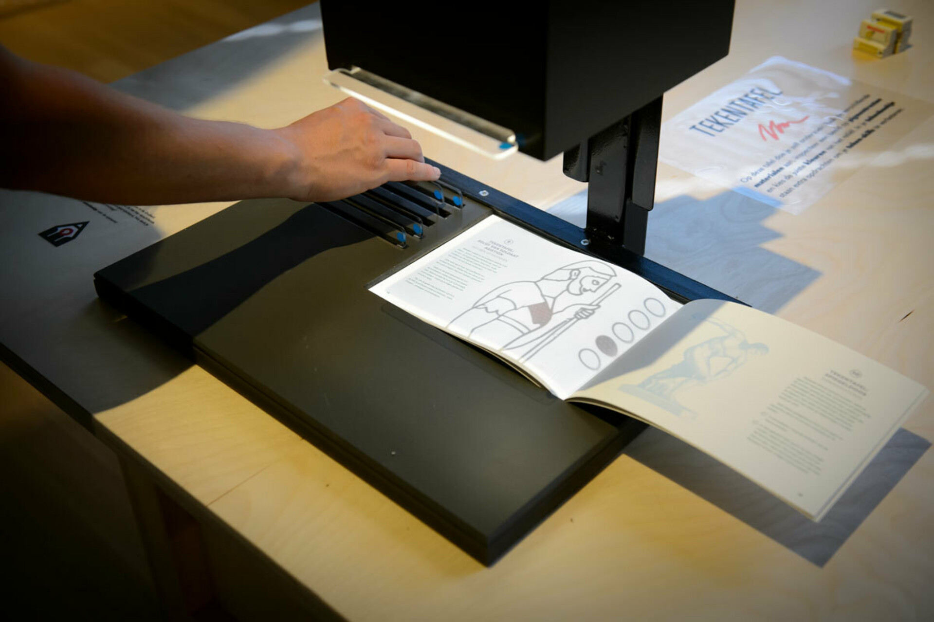 Op de tekentafel kan iedereen met behulp van instrumenten zoals een spiegeldoos aan de slag. Met ultraviolet licht kun je ervaren hoe onderzoekers sporen van pigmenten terugvinden op de oude beelden en er is ook genoeg ruimte om je verbeelding te laten spreken: teken bijvoorbeeld een ontbrekend hoofd op een beeld of verstrip een klassieke Griekse mythe. Leef je uit!