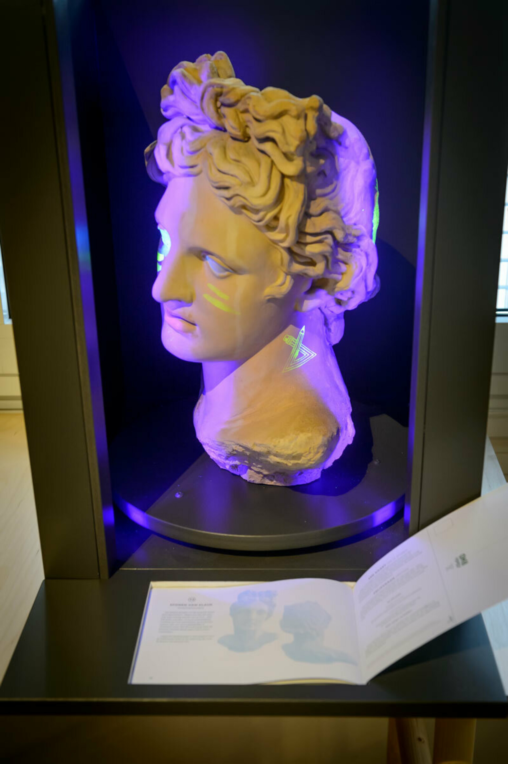 Ook kleur speelt een belangrijke rol. Beelden werden in de oudheid meestal rijk beschilderd. Een groot gipsen reliëf in het midden van de zaal krijgt op magische wijze soms zijn oorspronkelijke kleuren terug, en soms een wat modernere uitstraling.