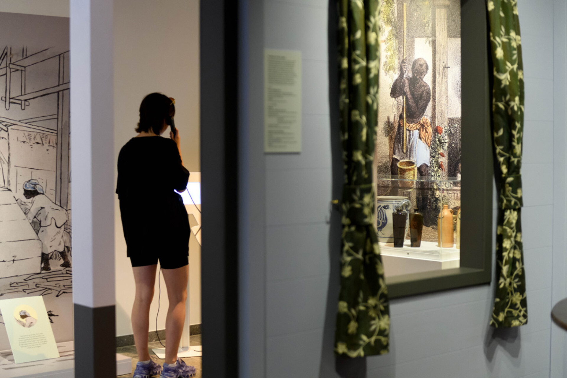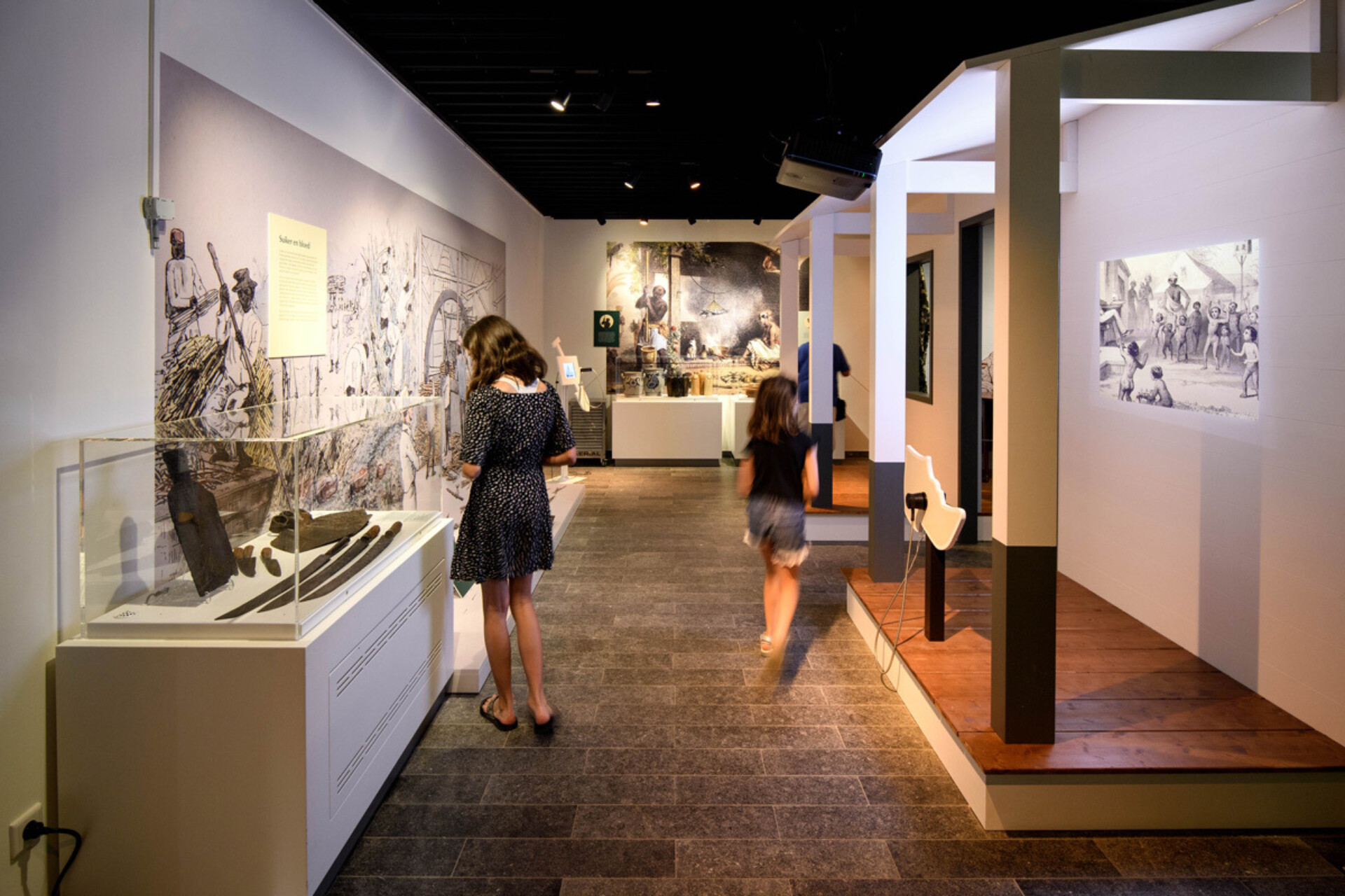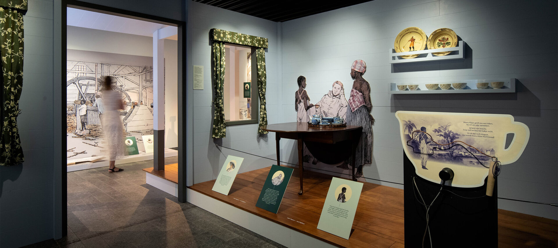 In de tentoonstelling laten we het schrijnende contrast zien tussen het harde werk op het land en het rijke leven in de koloniale landhuizen. De collectie onderschrijft dat contrast. Kapmessen, kappa’s, hakken en schoppen voor gebruik op de plantages lagen tussen kisten vol rijk versierde serviezen, pijpen en sierbeslag om voor het luxe leven van de plantage-eigenaren. Tegenovergesteld van wat je zou verwachten, begint het verhaal in de tentoonstelling bij het slavernij verleden en duiken we op het einde pas onder water.