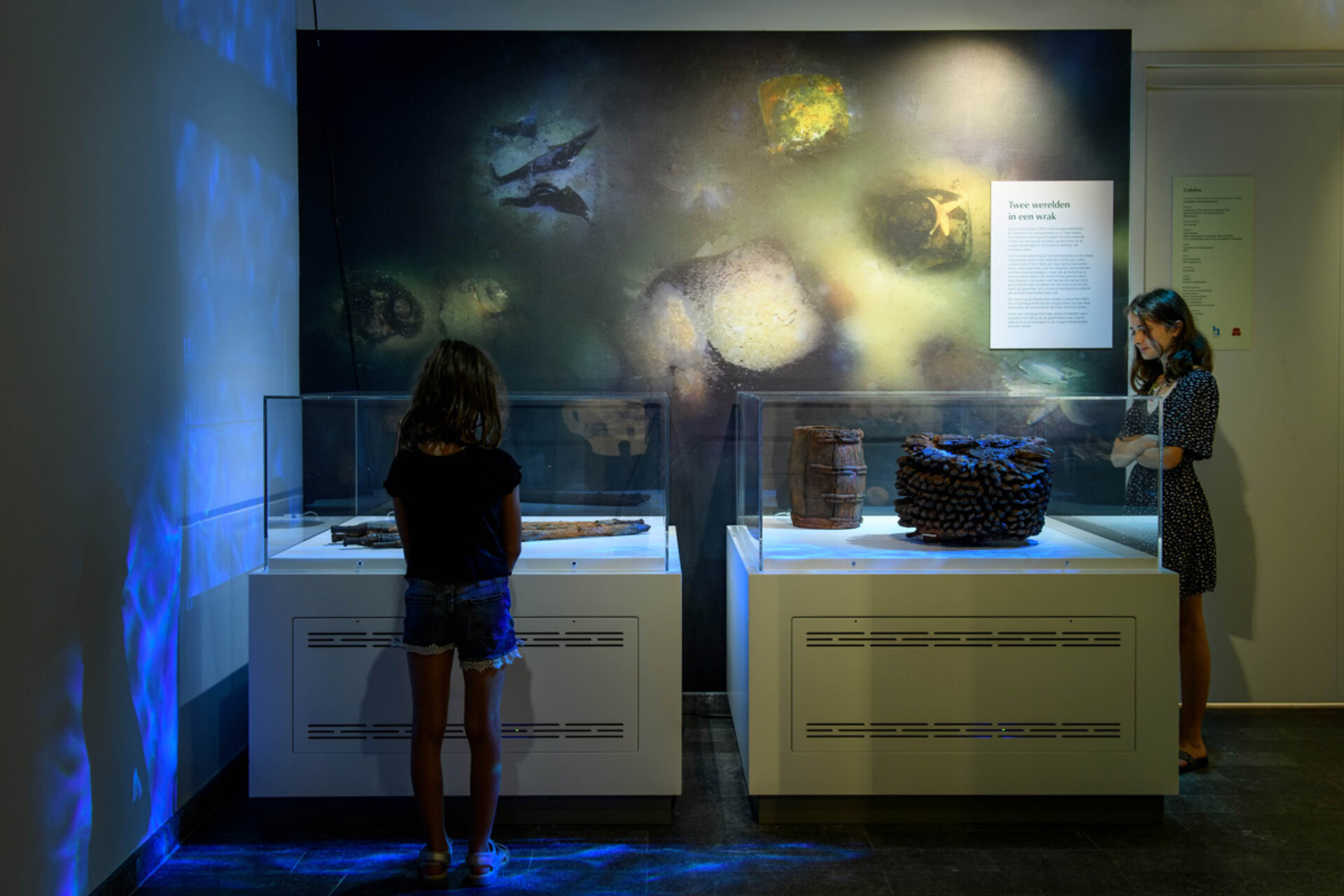 Aan het einde van de tentoonstelling duiken we onder water. Bezoekers zien hoe de voorwerpen, die het verhaal vertellen van ons koloniaal verleden, jarenlang bewaard zijn gebleven in een scheepswrak op de zeebodem.